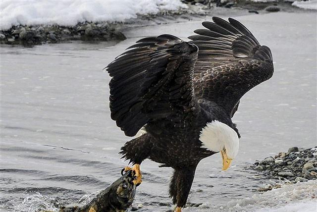 成年的白头海雕有着强大的爪子,抓力能达到人类的六倍左右,搭配上长达两米的翼展,让它在捕猎时速度极快,几乎无处遁形。