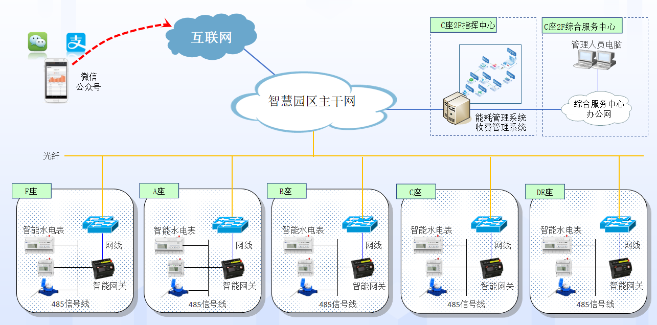 项目方案:部署智能水电表、智能网关等设备,搭建智慧园区主干网,构建能耗管理系统与收费管理系统,对接微信公众号,实现数据采集、计费、缴费、开票等全流程数字化管理。