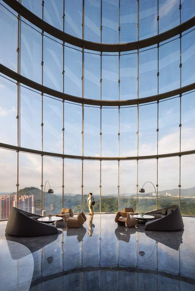 50米高的空中大堂采用无柱设计,弧形玻璃幕墙将周边山水尽收眼底,模糊了办公与自然的边界。
