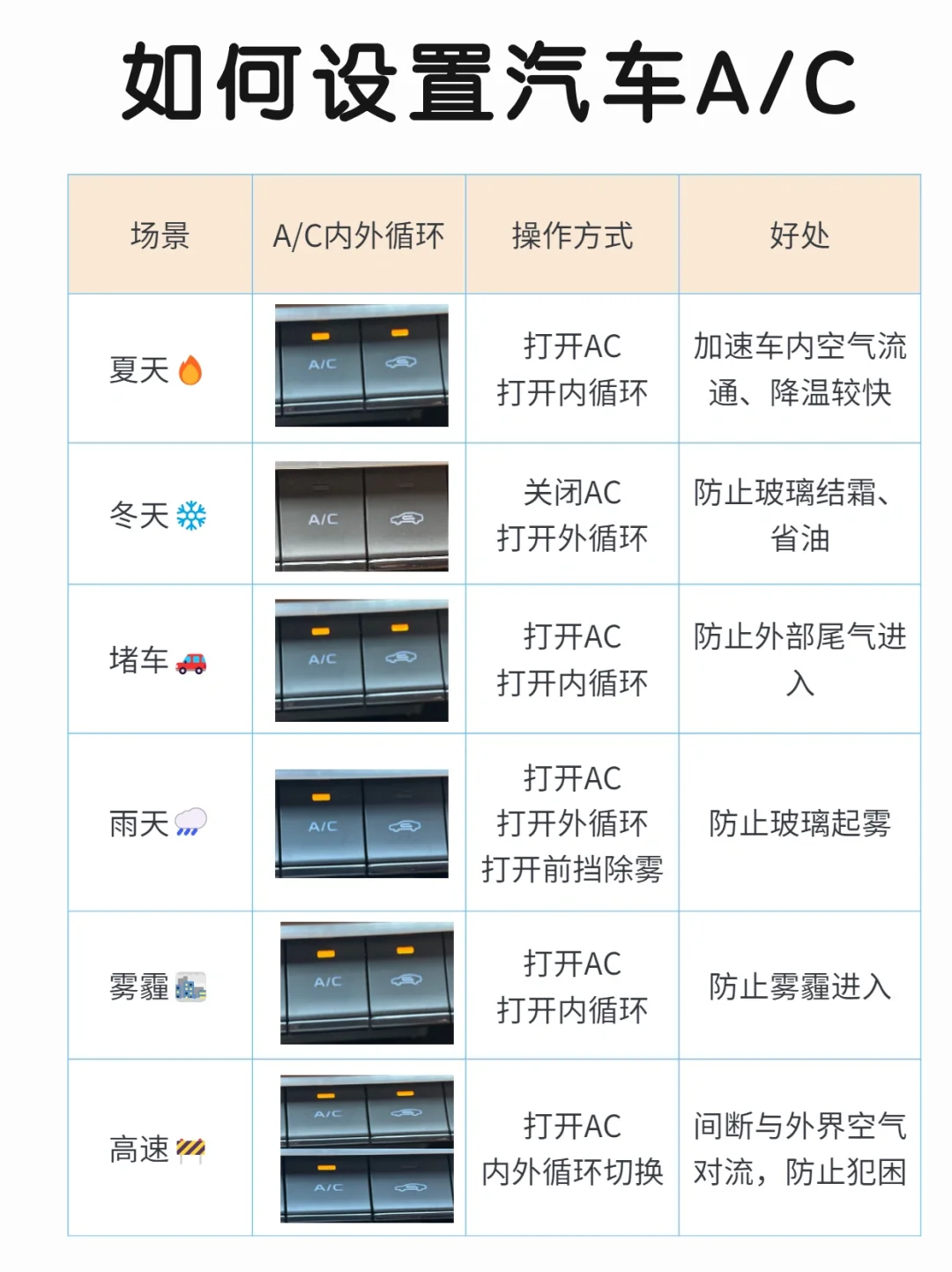 很多姐妹👭觉得油耗比别人高很多,可能是汽车A/C和内外循环的方式错了,我整理了详细的汽车A/C使用方法,希望能给姐妹们带来帮助!
