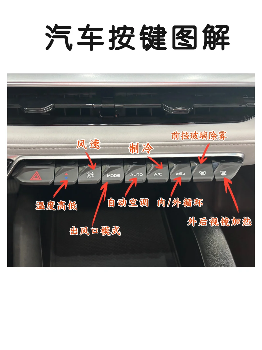 🌧️雨天:打开A/C和外循环,打开前挡除雾开关,防止玻璃起雾