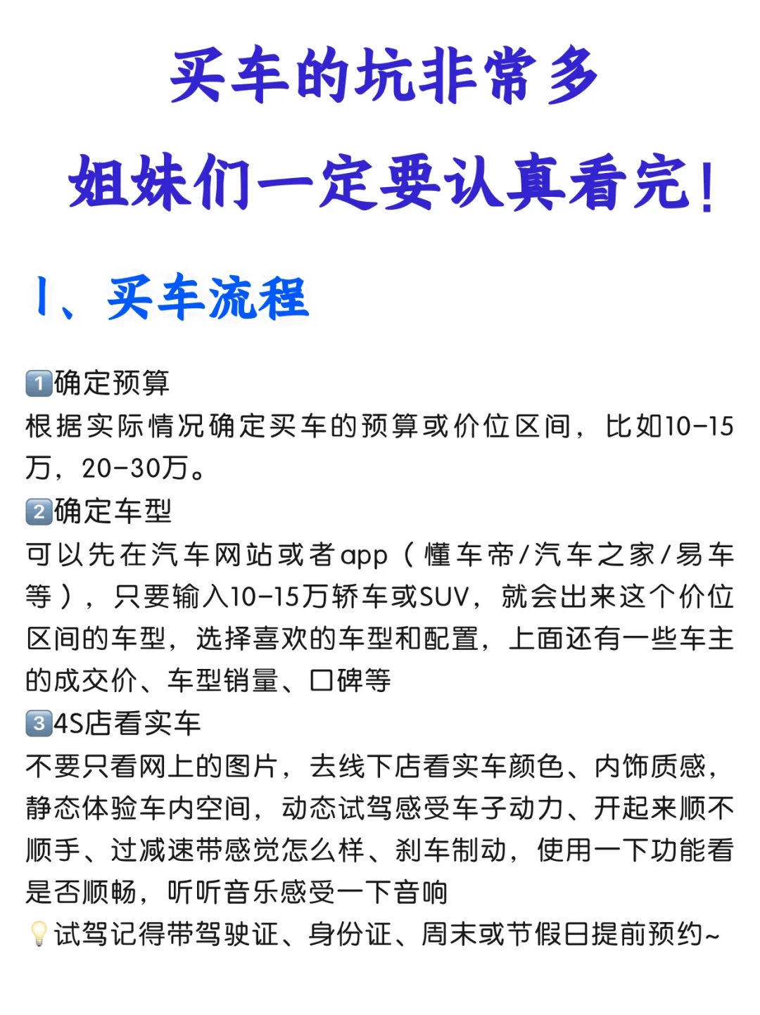 陪家里人去买了两台车以后,发现买车真的巨多坑‼️也有一些姐妹想知道买车的流程和闭坑,我熬夜总结了一些买车的注意事项,希望能帮到大家。 学会买车,离酷酷的大女主又近了一步😊