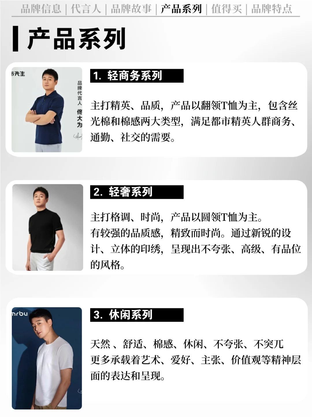 [清单R] 产品系列:布先生总体设计风格简约、大气,旗下拥有轻商务、轻奢、休闲三大产品系列。