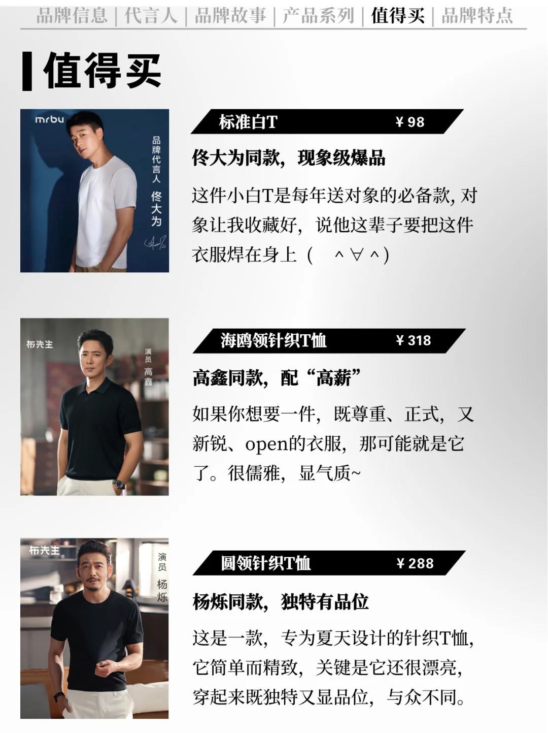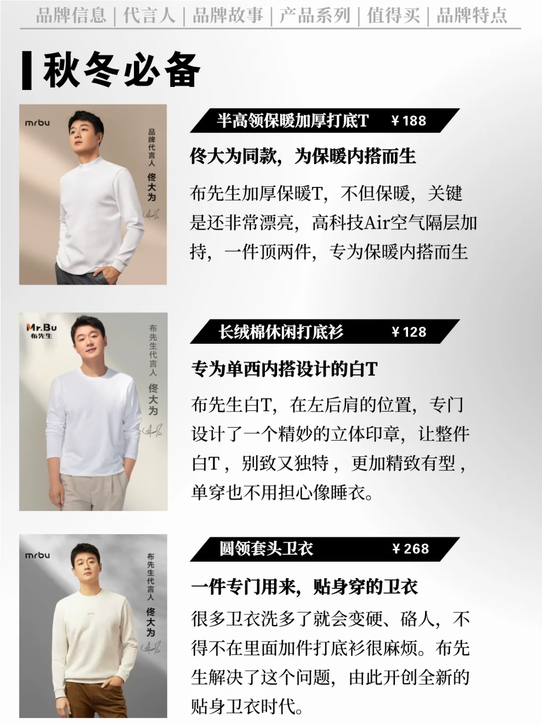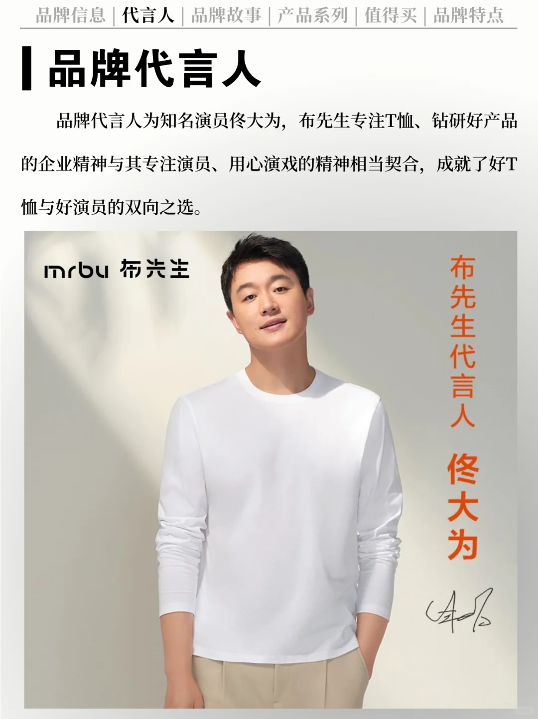 [哇R] 代言人:品牌代言人为知名演员佟大为,布先生专注T恤、钻研好产品的企业精神与其专注演员、用心演戏的精神相当契合,成就了好T恤与好演员的双向之选[害羞R]。
