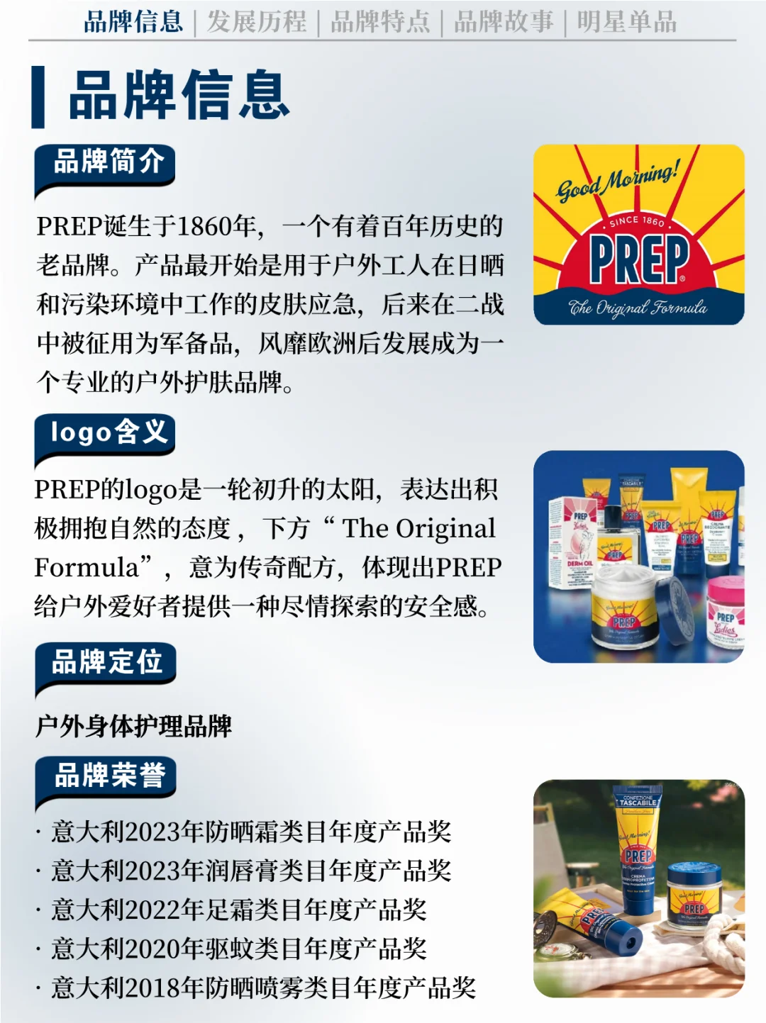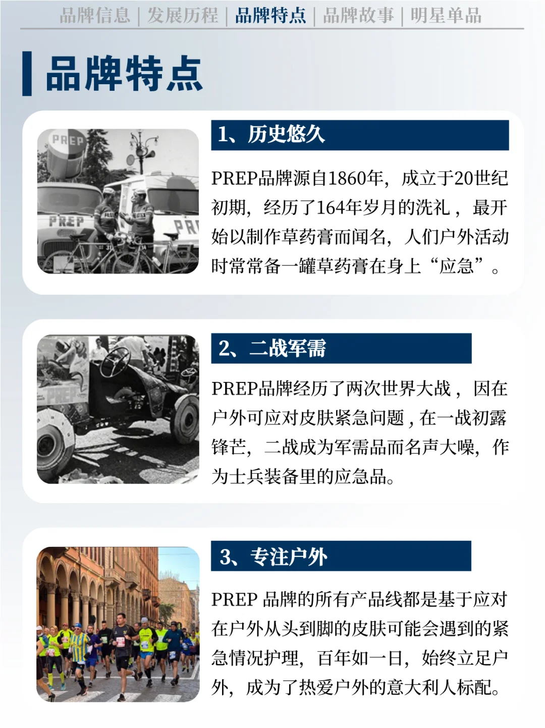 👉 品牌简介:PREP诞生于1860年,一个有着百年历史的老品牌。产品最开始是用于户外工人在日晒和污染环境中工作的皮肤应急,后来在二战中被征用为军备品,风靡欧洲后发展成为一个专业的户外护肤品牌。