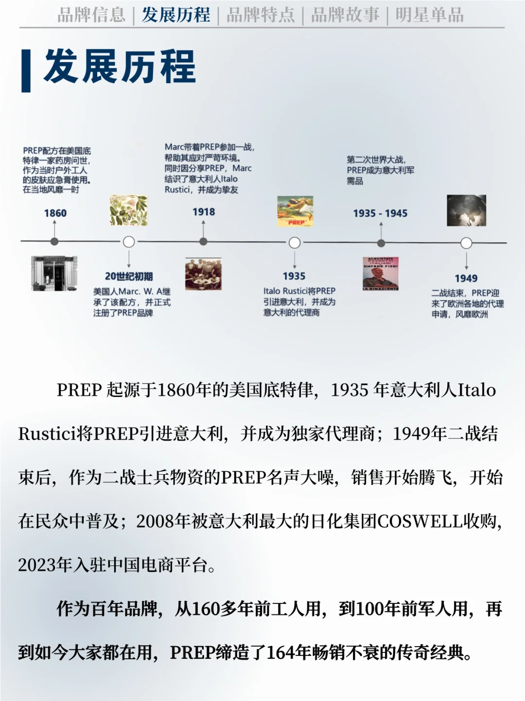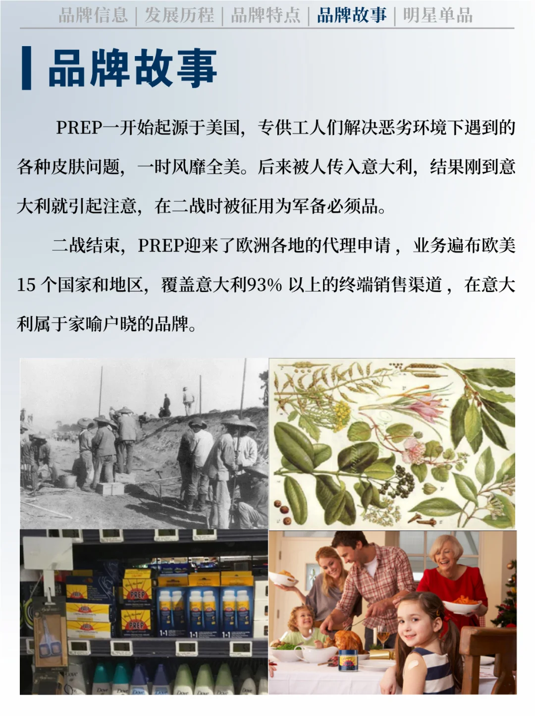 📝 品牌故事:PREP一开始起源于美国,专供工人们解决恶劣环境下遇到的各种皮肤问题,一时风靡全美。后来被人传入意大利,结果刚到意大利就引起注意,在二战时被征用为军备必须品。二战结束,PREP迎