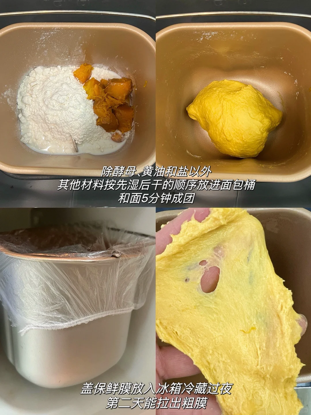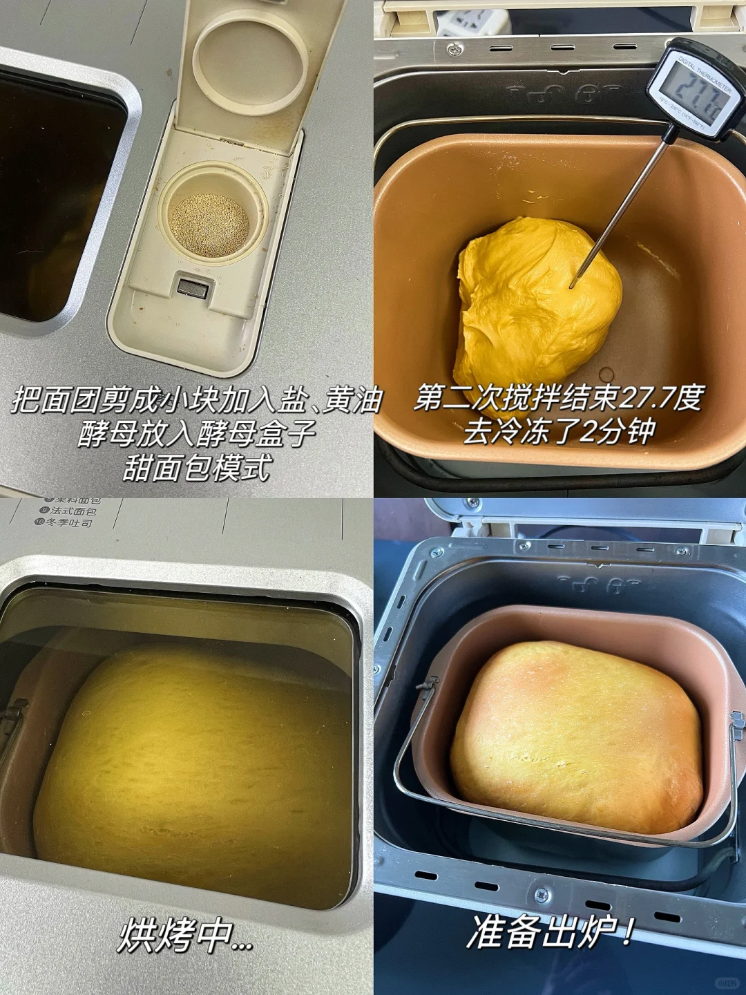 3️⃣第二天:取出面包桶,面团可拉出粗膜。把面团剪成小块加入盐、黄油,酵母放入酵母盒子,甜面包模式