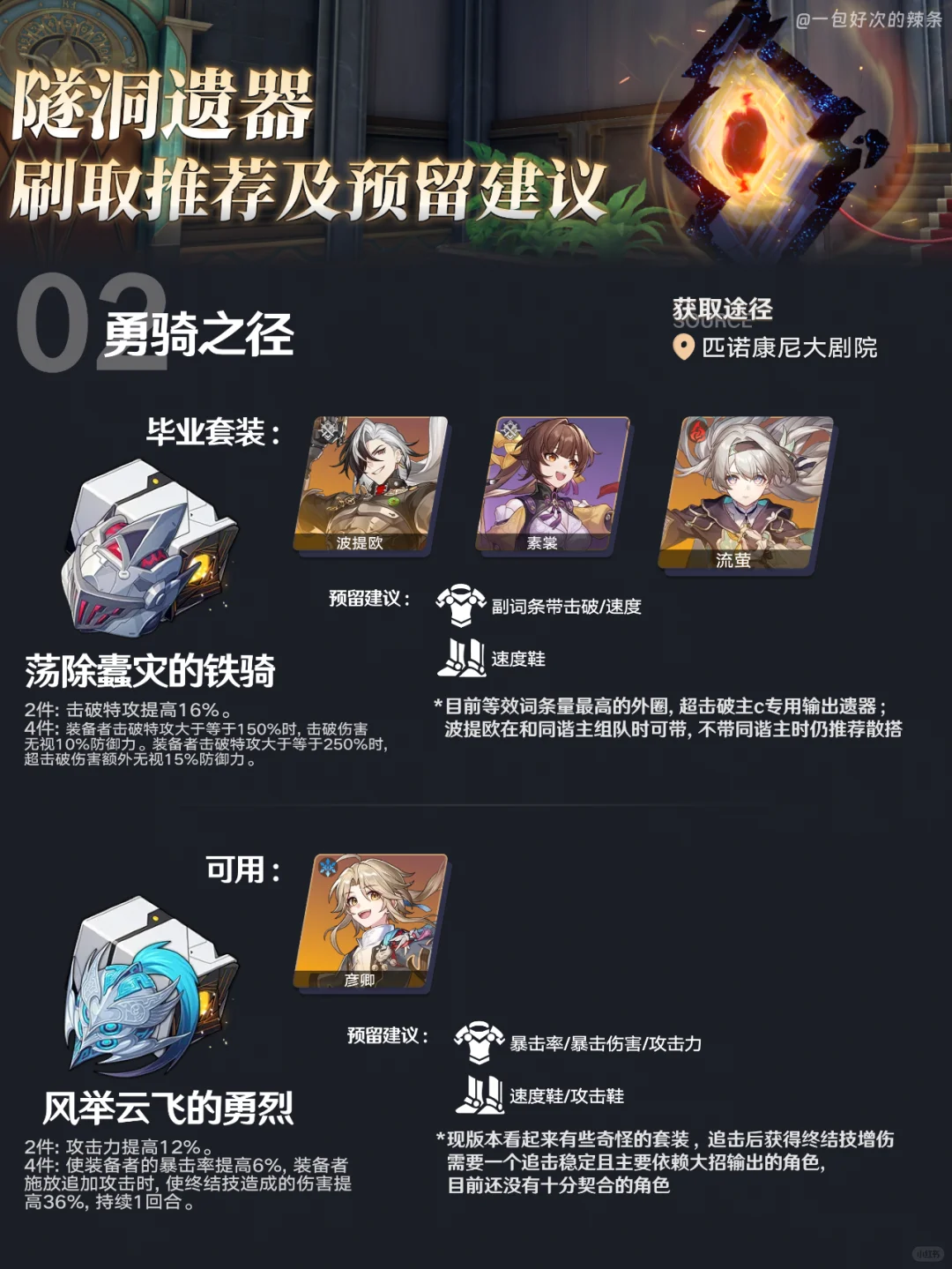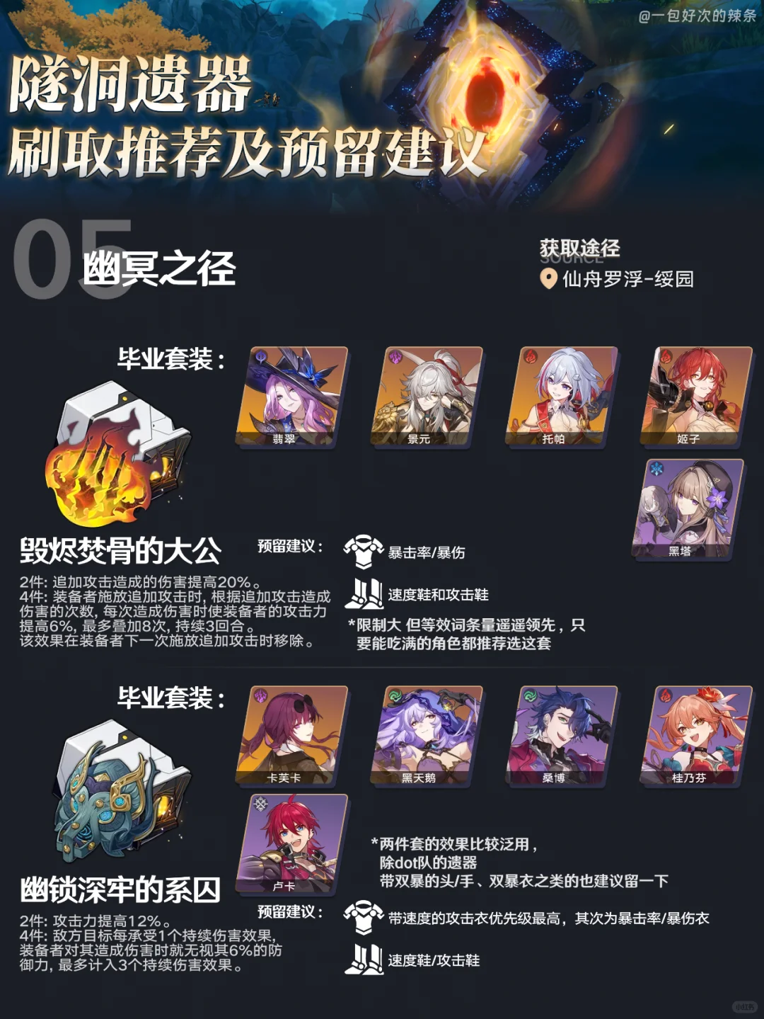 大家好,这里是一包好次的辣条! 惯例在双倍掉落前带来全外圈遗器刷取和预留推荐~ 再也不纠结刷什么啦~ ————————————— 如有遗漏/错误欢迎指出,共同进步~ 最近新玩家/回坑玩家多,大家友善讨论哦~ —————————————