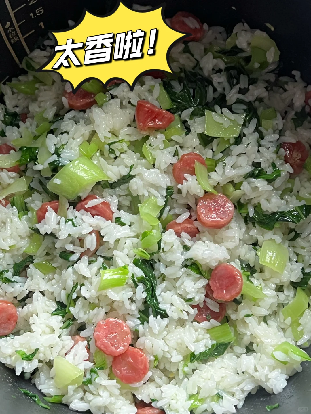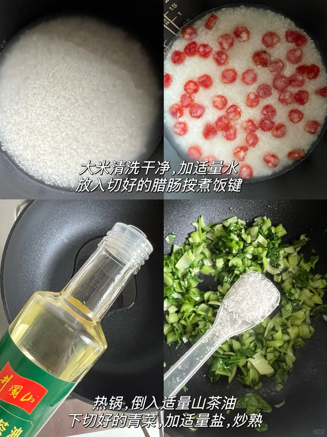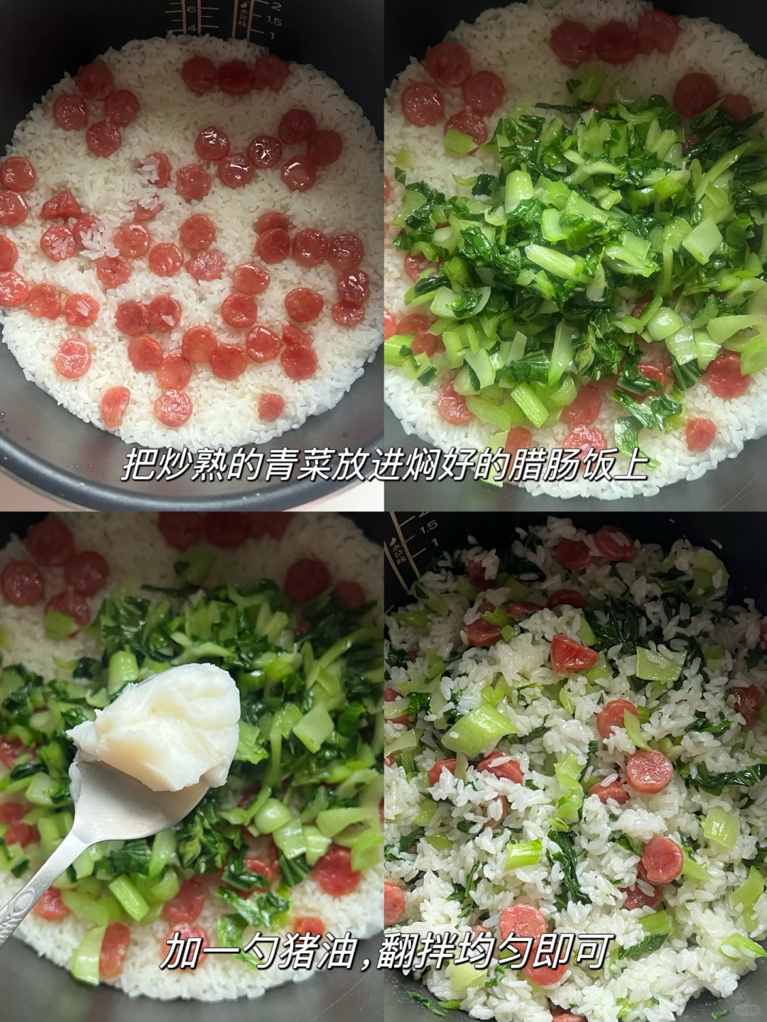 2️⃣青菜洗净切小段,热锅倒入山茶油下青菜翻炒,加1小勺盐(可以比平时适量增加一点),炒熟,放进焖好的香肠饭上,加一勺猪油,翻拌均匀就可以吃啦!