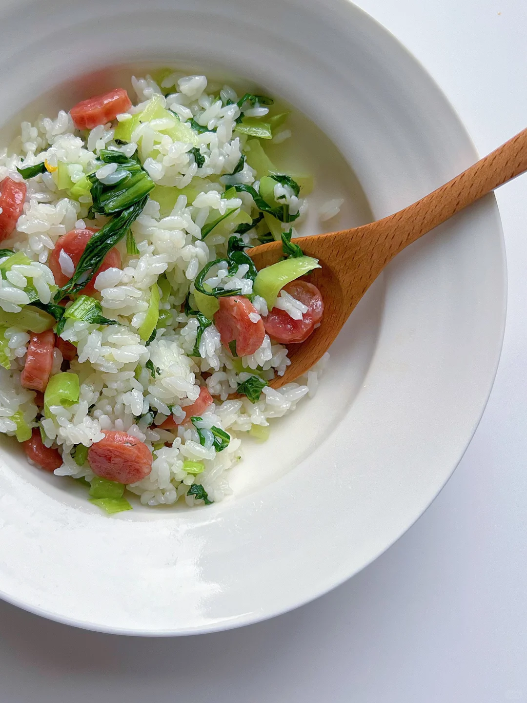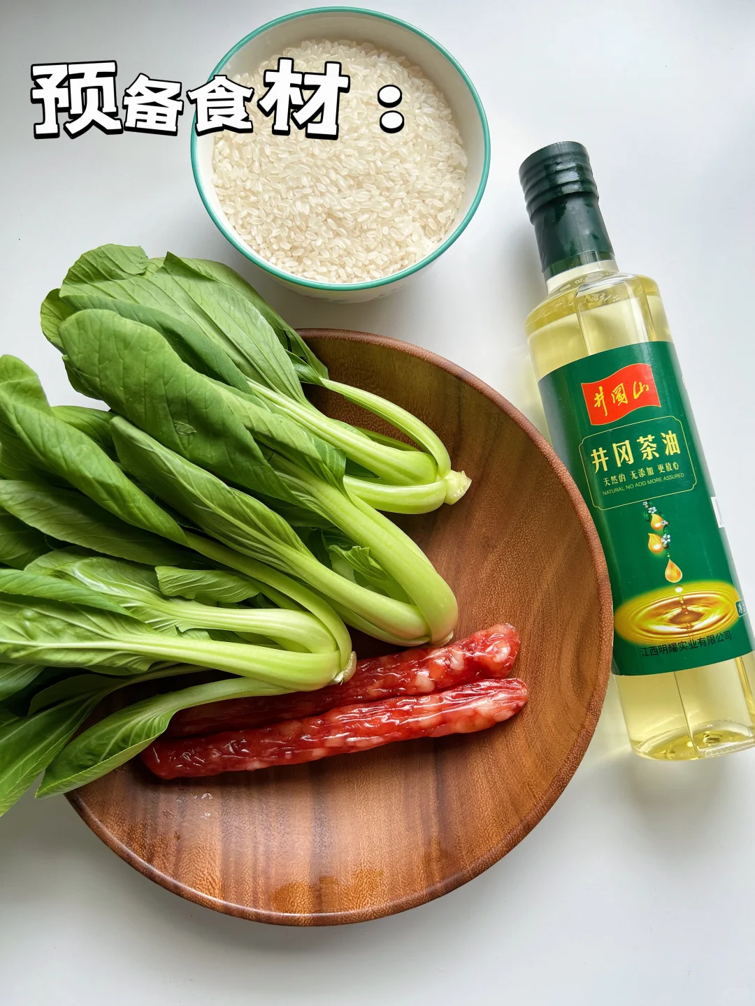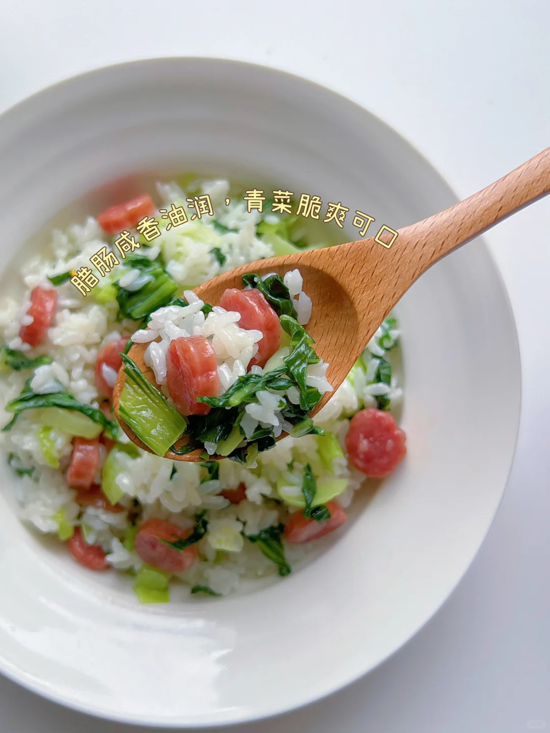 2️⃣青菜洗净切小段,热锅倒入山茶油下青菜翻炒,加1小勺盐(可以比平时适量增加一点),炒熟,放进焖好的香肠饭上,加一勺猪油,翻拌均匀就可以吃啦!