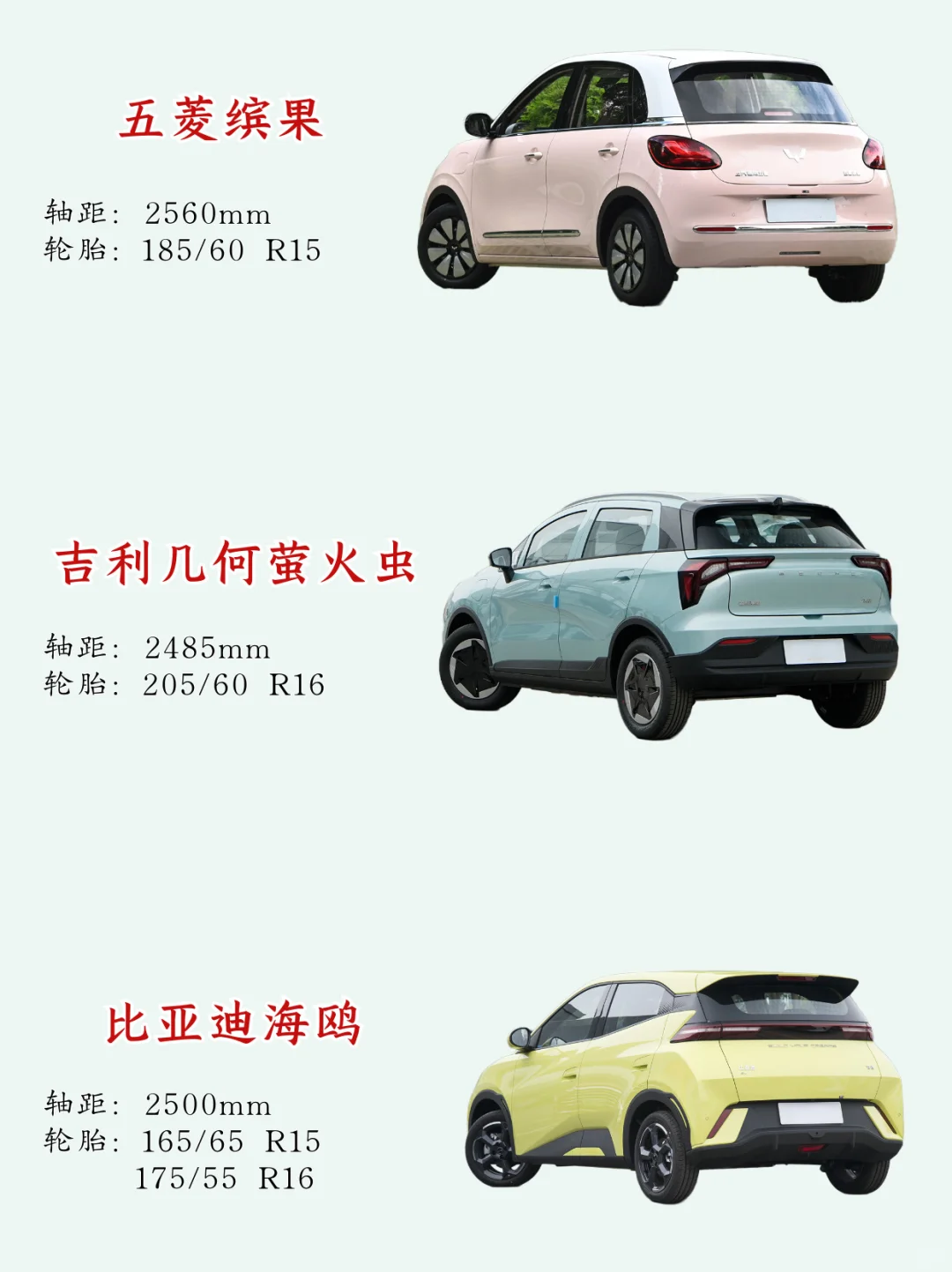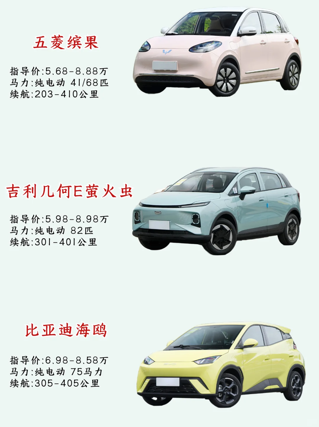 我的目标是一台纯电🔋小车,虽然拿驾照很久了,但是很少开车,所以要适合新手女司机开,➡️要能满足节假日一家五口去周边游玩,续航和空间,所以选来选去最后留下了市面上热门的三款电车➡️吉利几何E萤火虫、五菱缤果、比亚迪海鸥