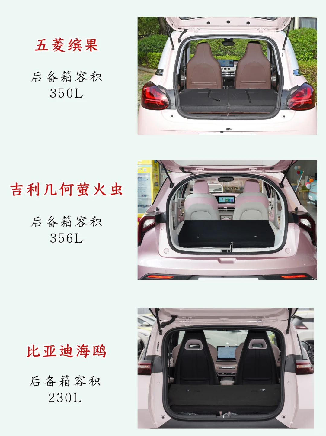 因为经常要和朋友们一起出游,所以空间方面要求还蛮大的,➡️吉利几何E萤火虫的空间更大,后排有3个座位,后备箱有356L,并且灵活性也很高,后排可以整体放倒,出游的时候玩累了,还能够在车上小憩,👌非常适合我这种爱出门玩的,并且,就算不把后排放倒,就直接睡后排座椅上,🛏️几何E萤火虫宽1338mm的后排还是比海鸥1223mm和缤果1280mm的睡得舒服