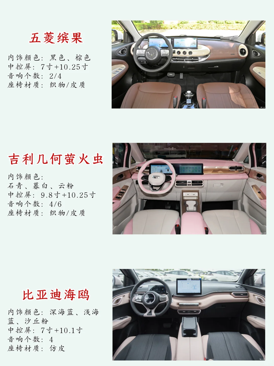 内饰方面:海鸥简约清新、缤果复古时尚、几何E萤火虫更加豪华有档次。