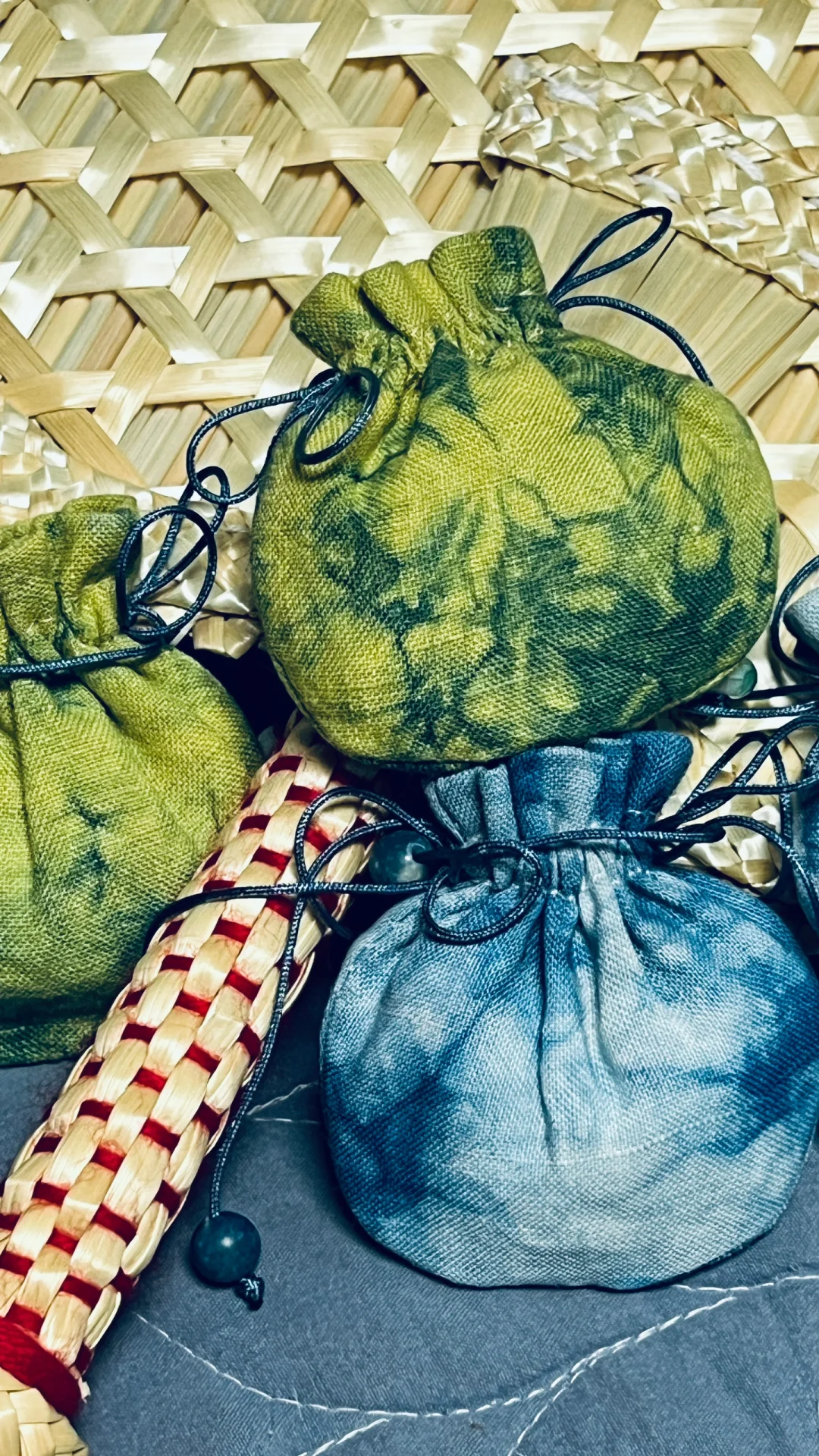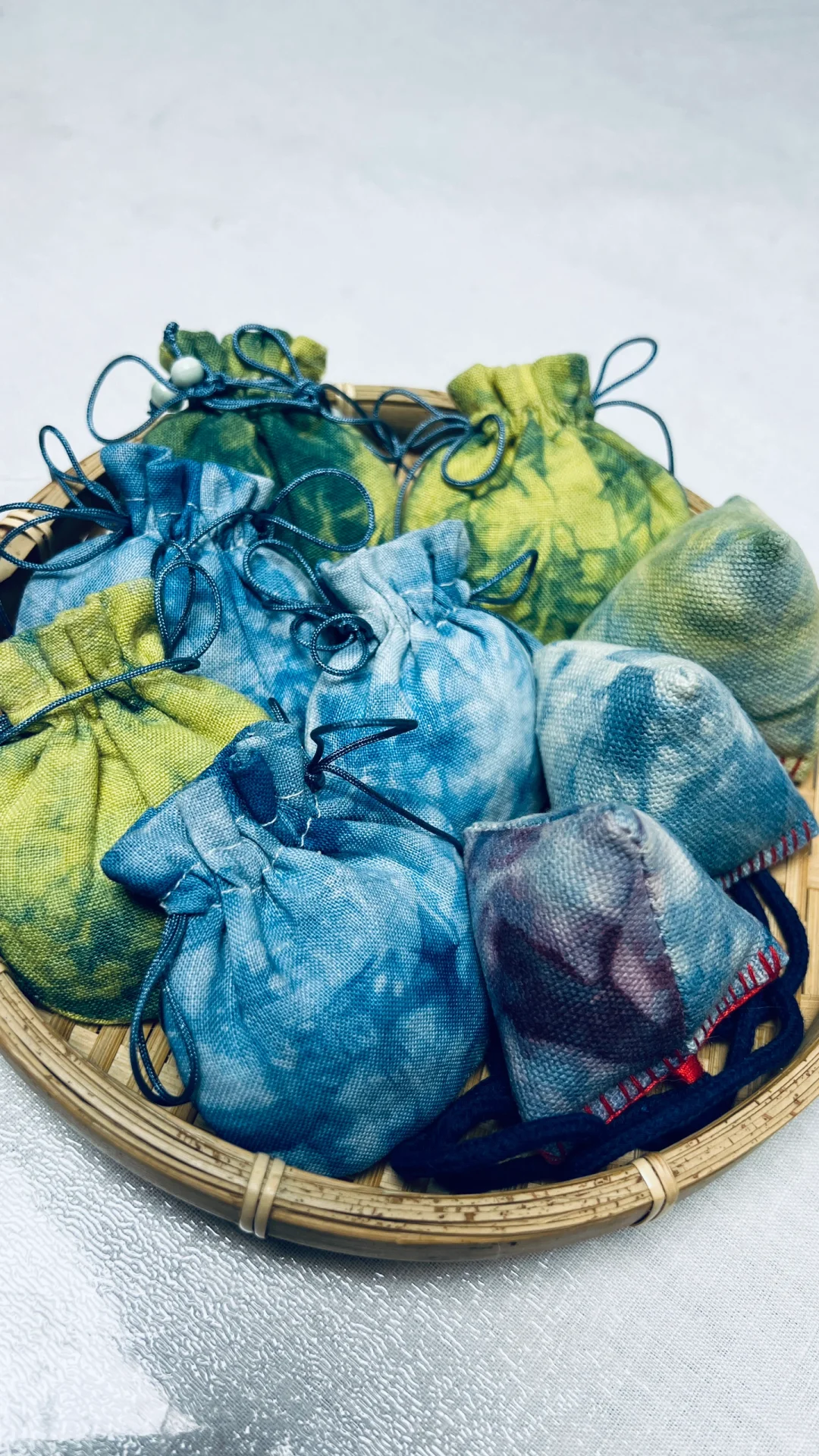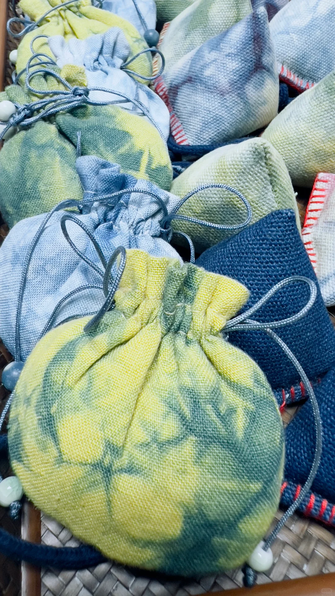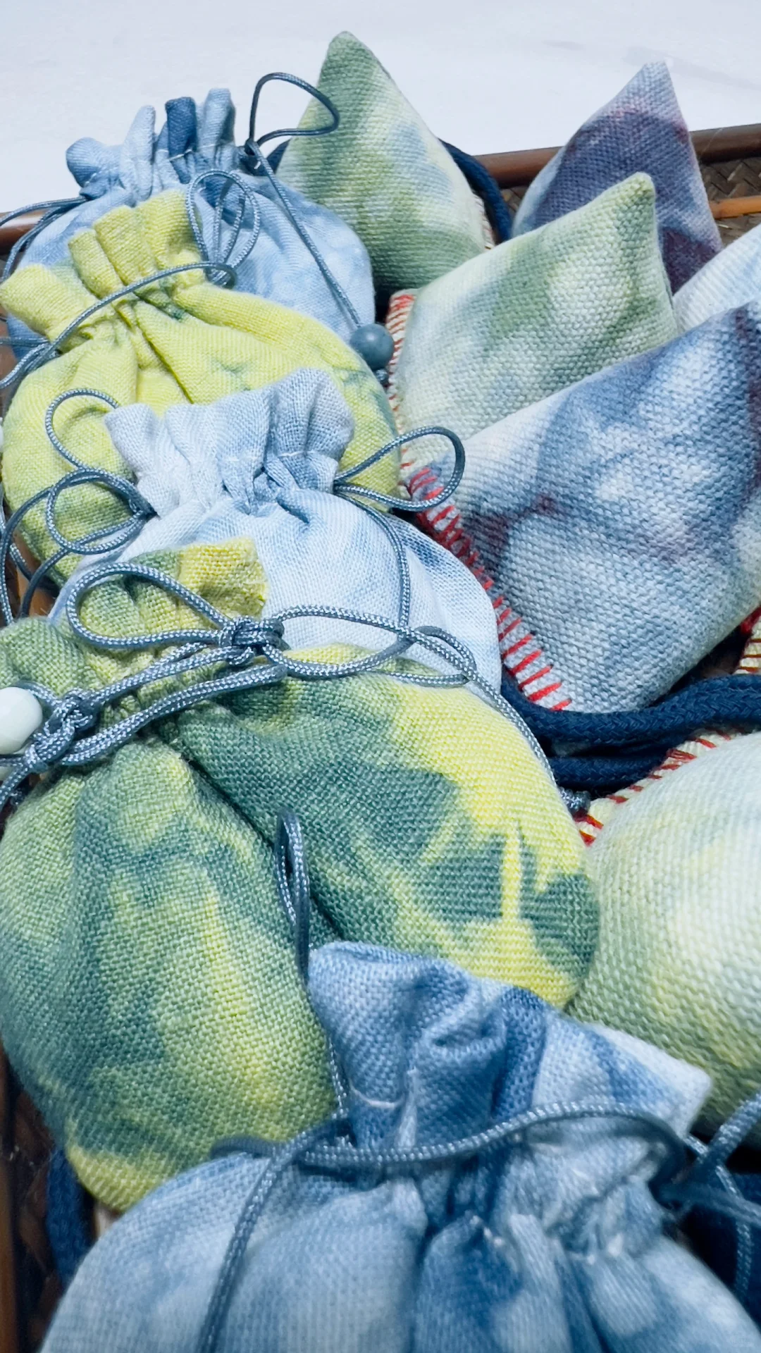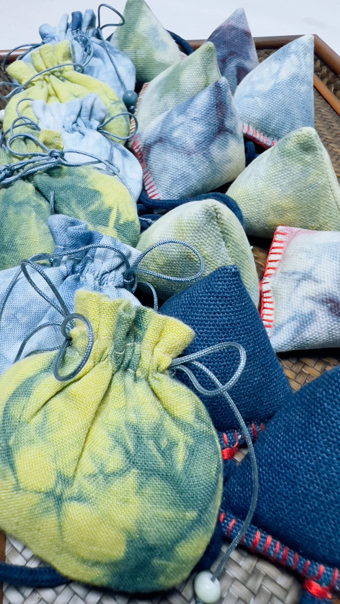 植物染小香包,蓝色来自蓝染,黄色是槐树花;紫色是红色茜草+蓝染套色得到;