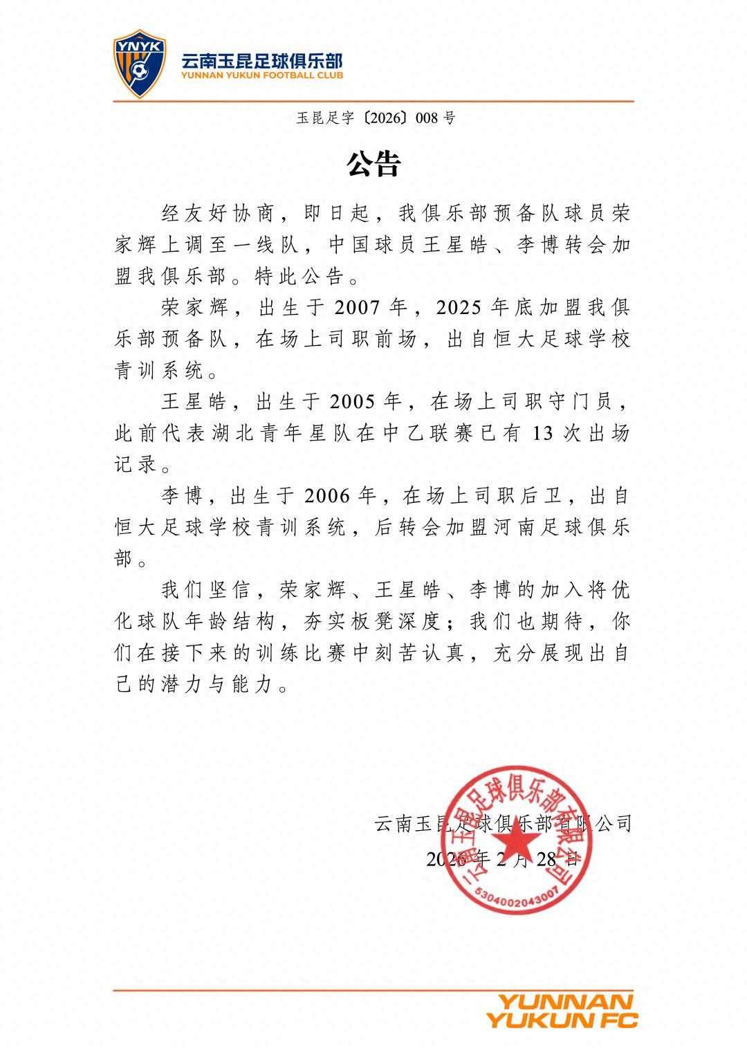 球员荣家辉、王星皓、李博加盟云南玉昆