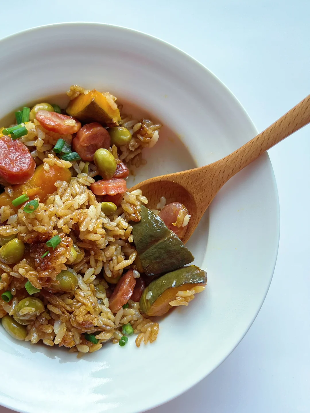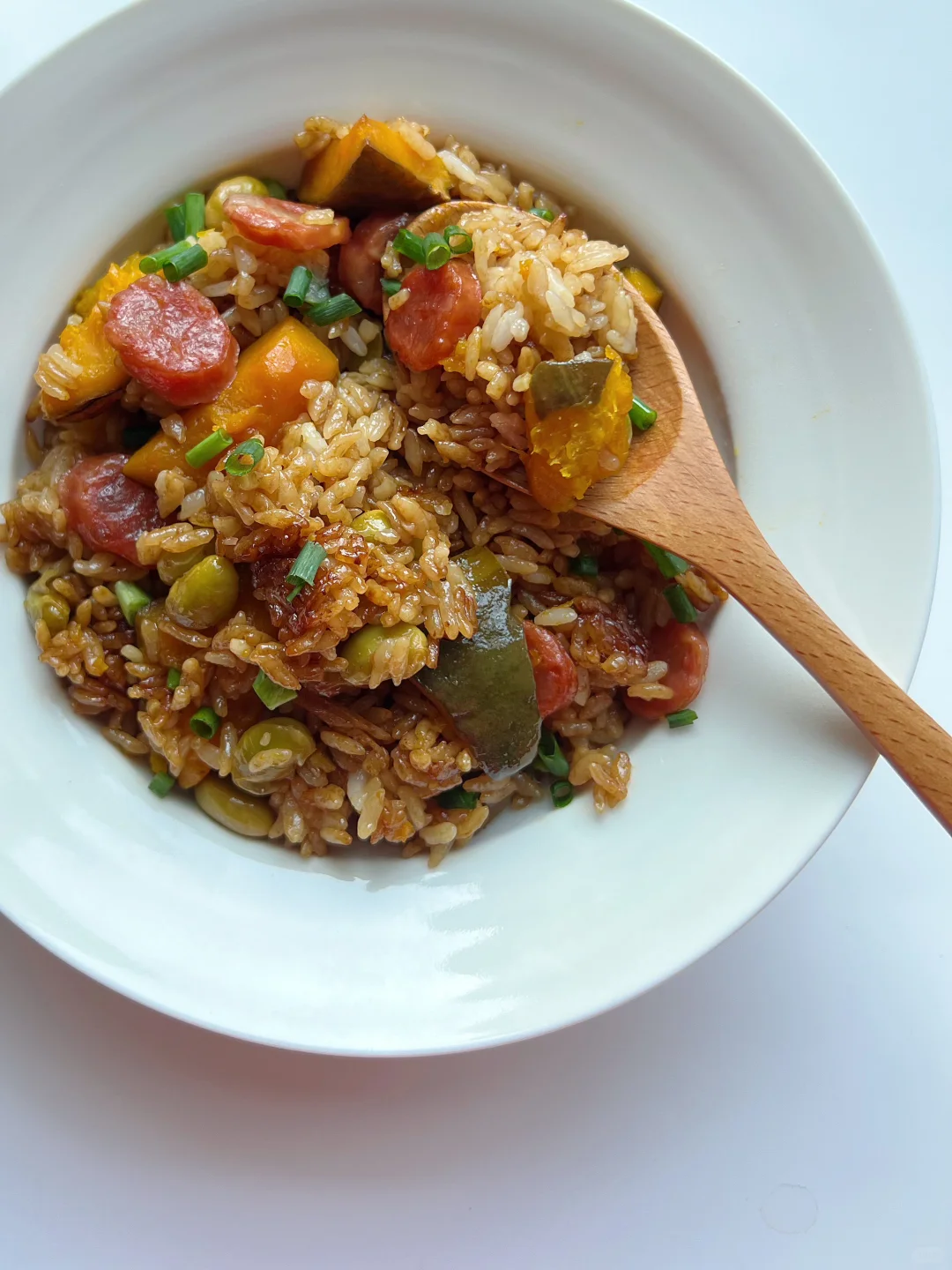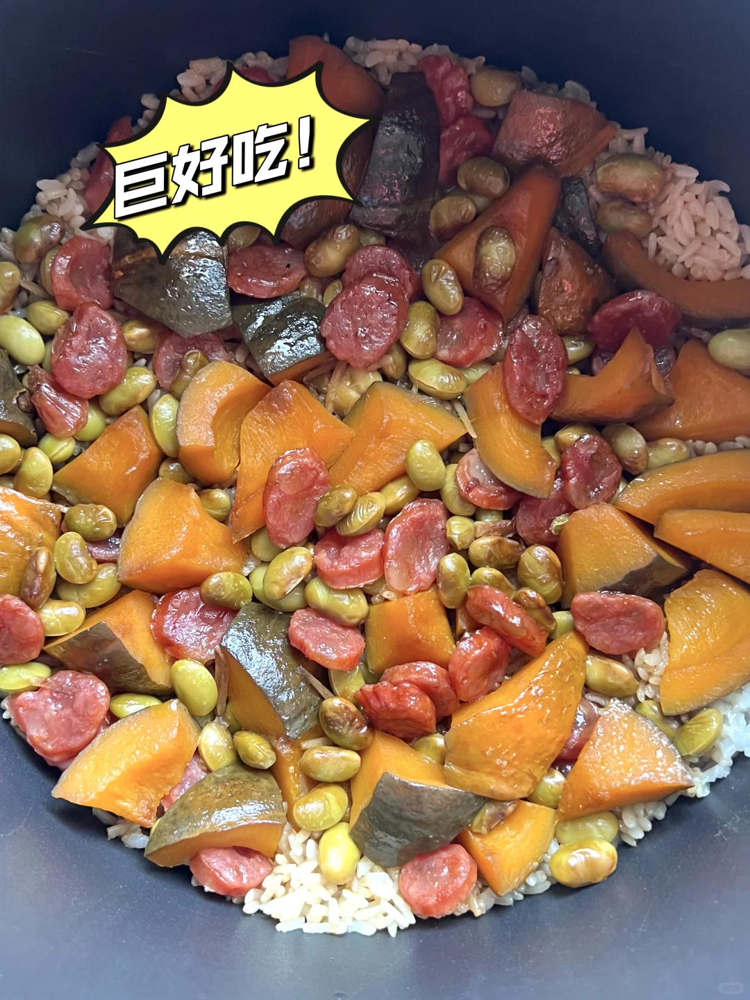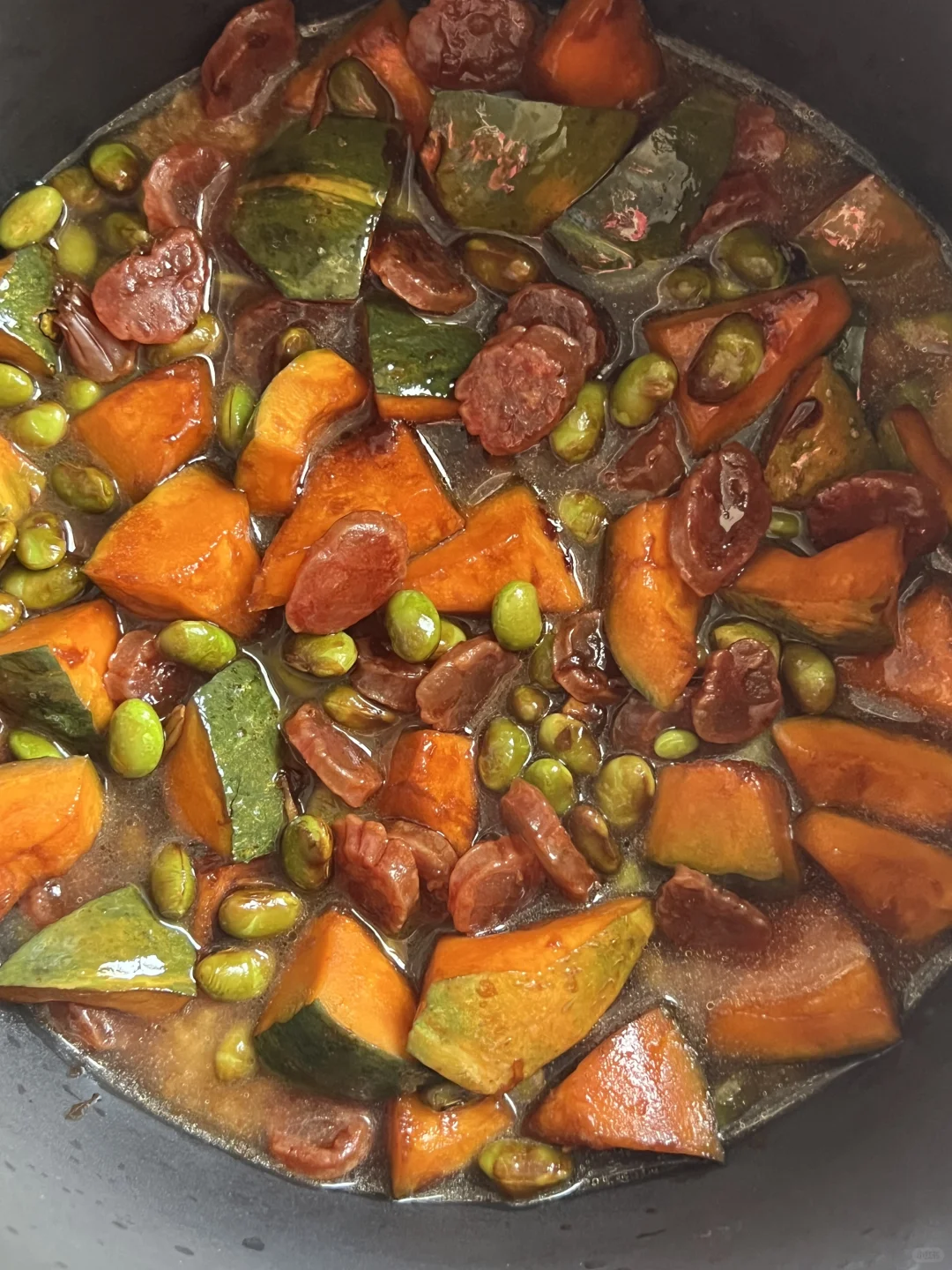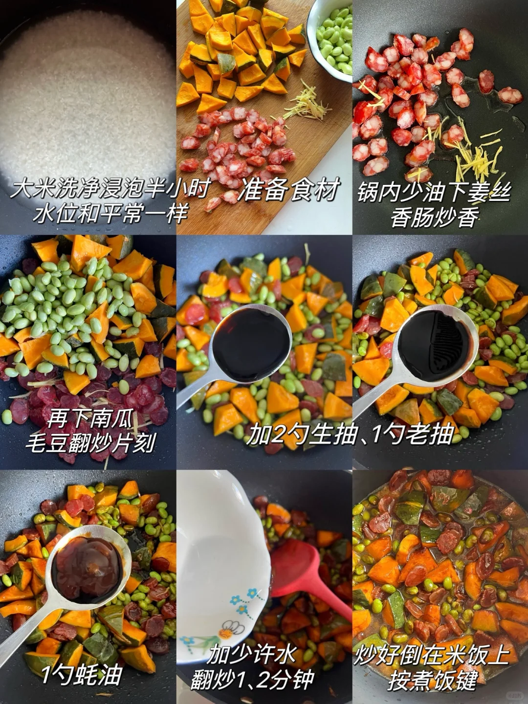 3️⃣锅内少油下姜丝、香肠炒香,再下南瓜、毛豆翻炒片刻,加2勺生抽、1勺蚝油、1勺老抽翻炒片刻,干的话可以适当加一点点水