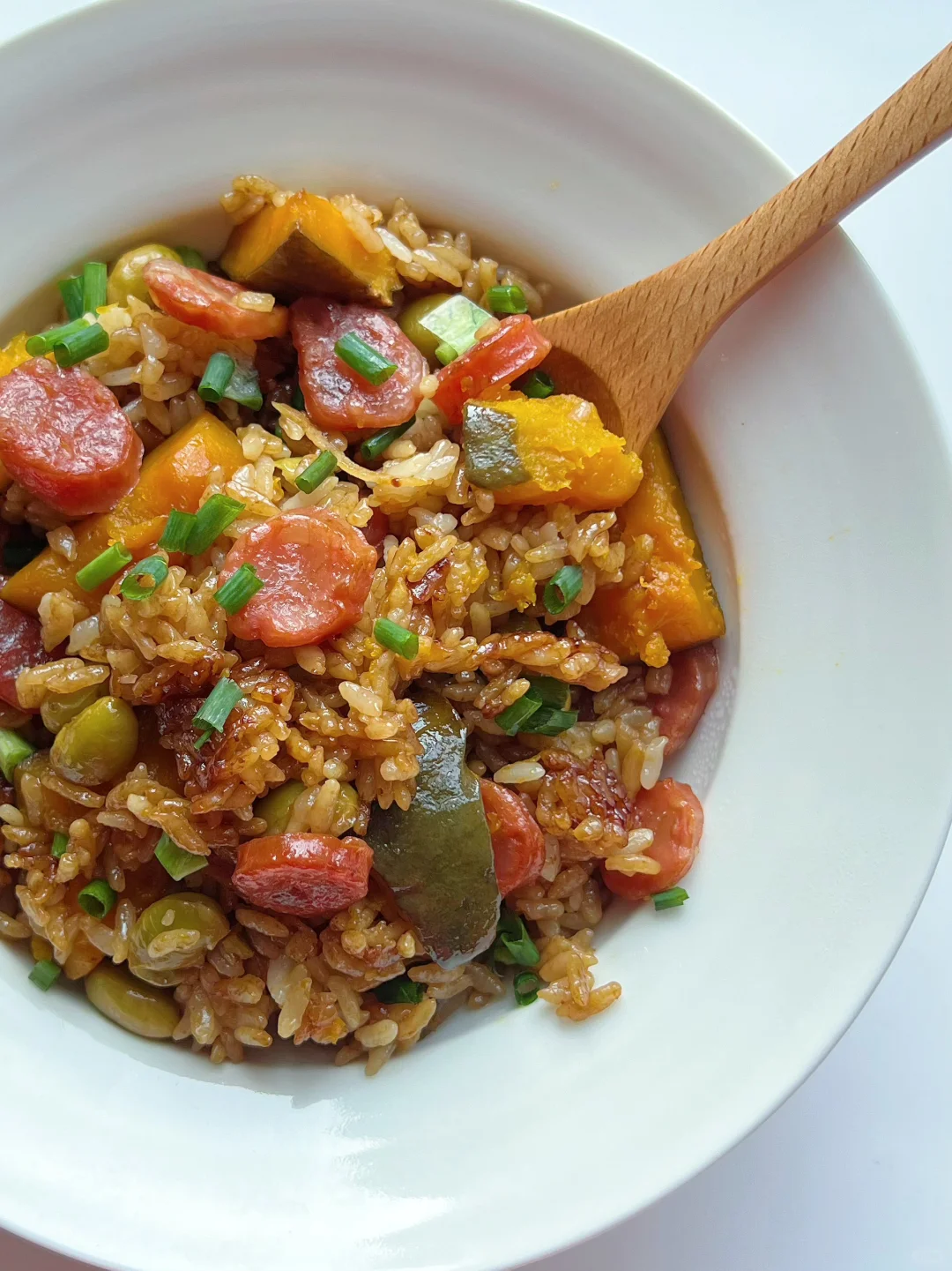 4️⃣炒好倒在米饭上,按煮饭(或者杂粮饭)键,煮好焖10分钟,出锅撒葱花翻拌均匀即可