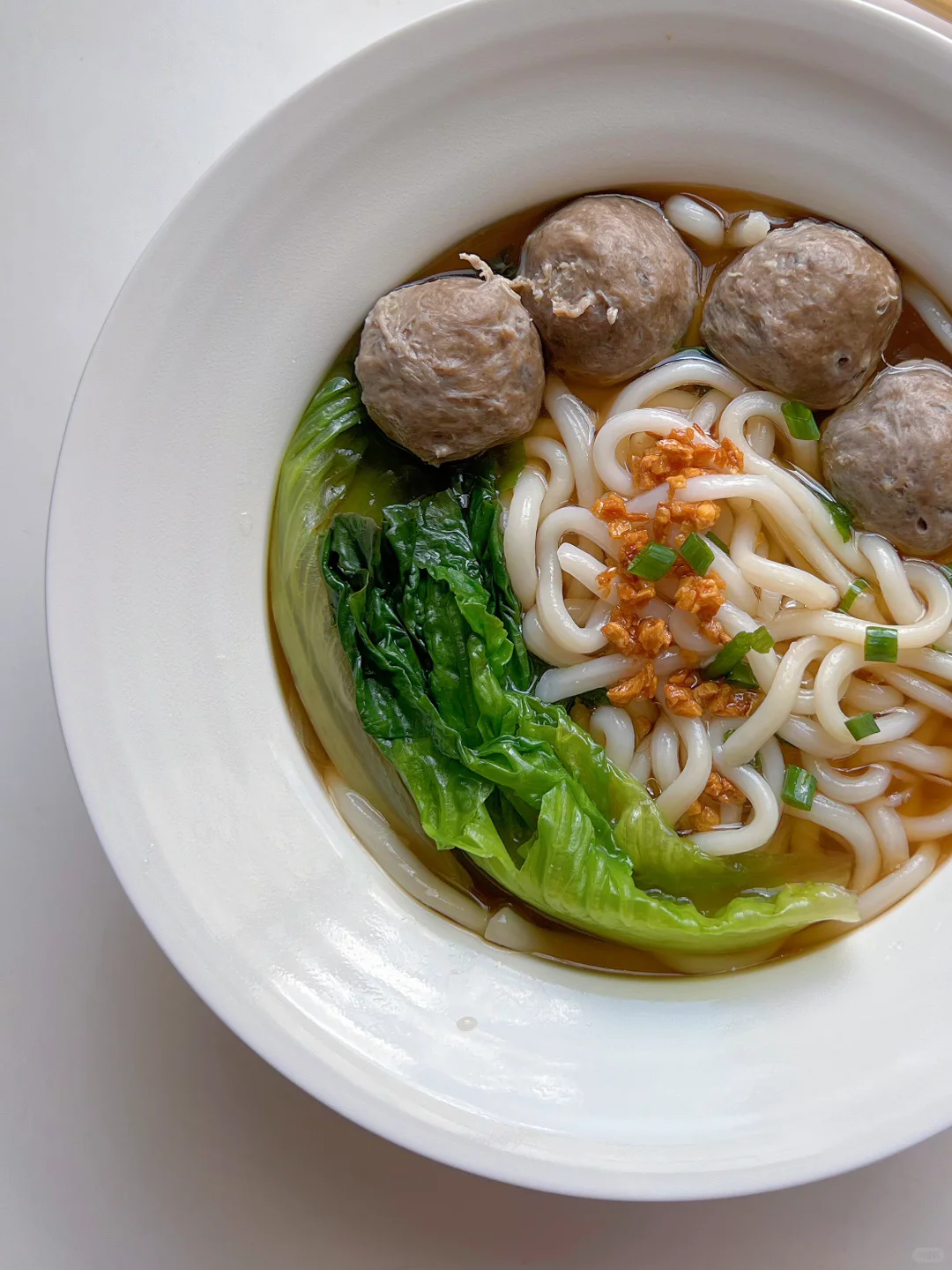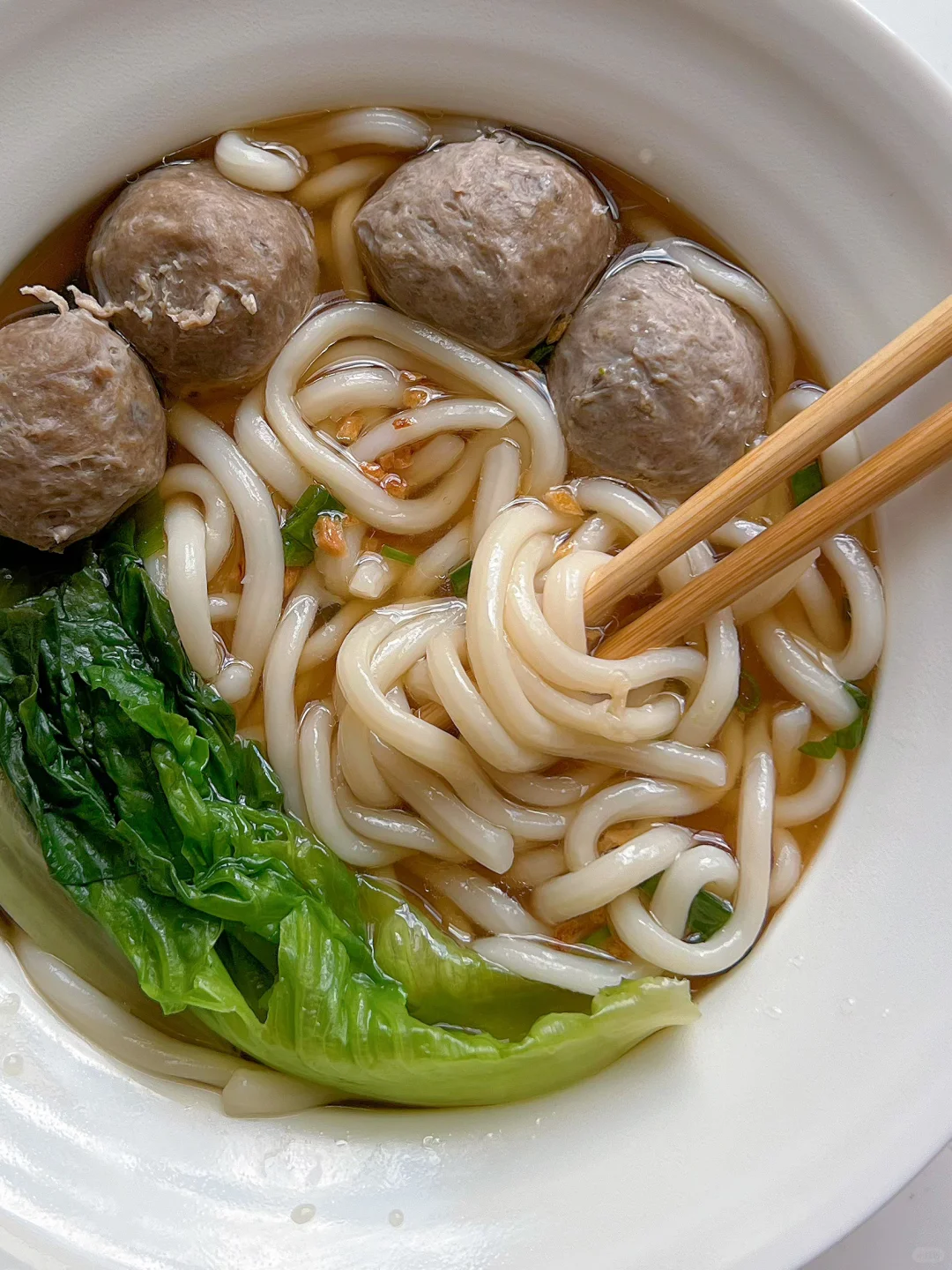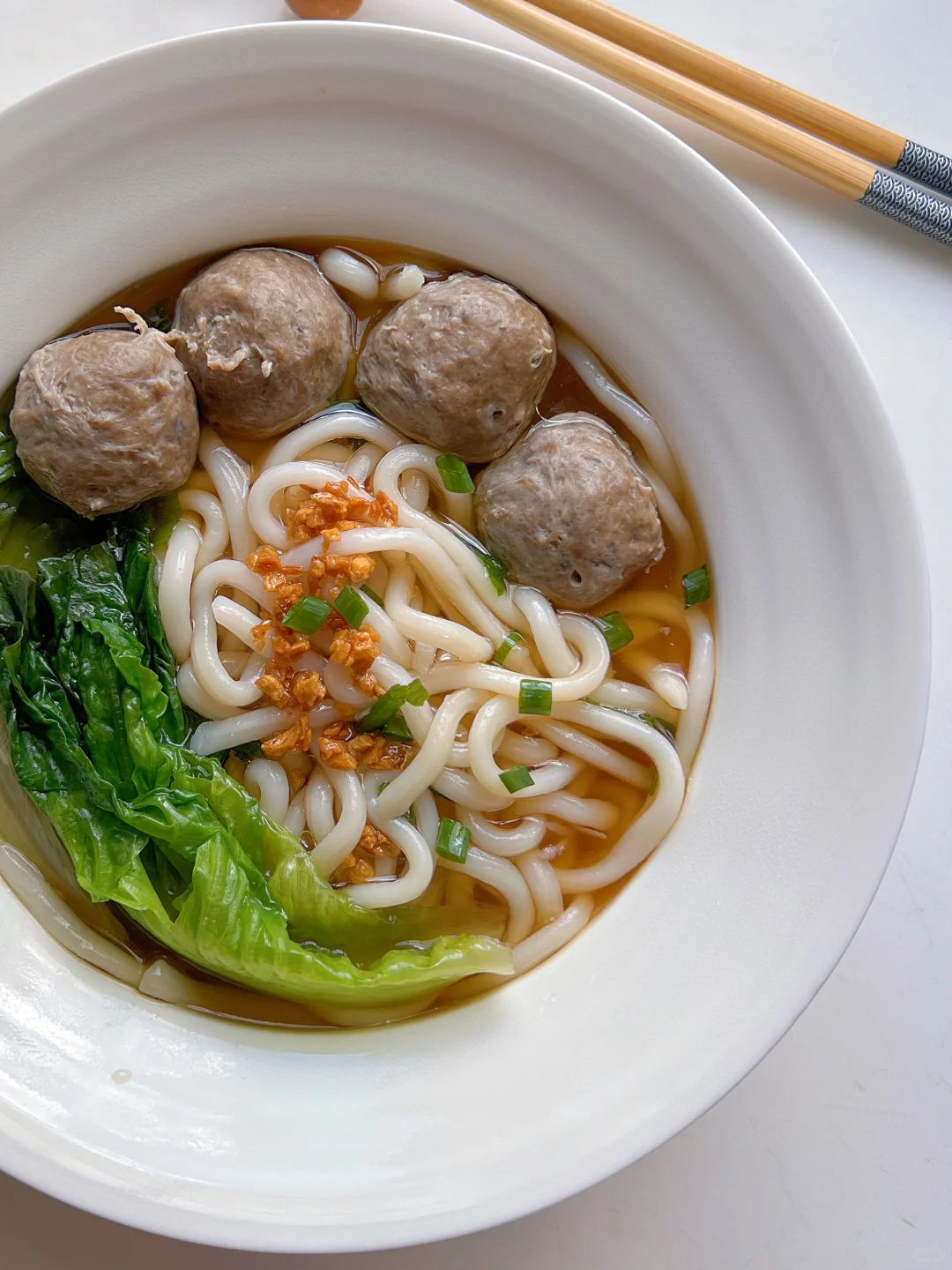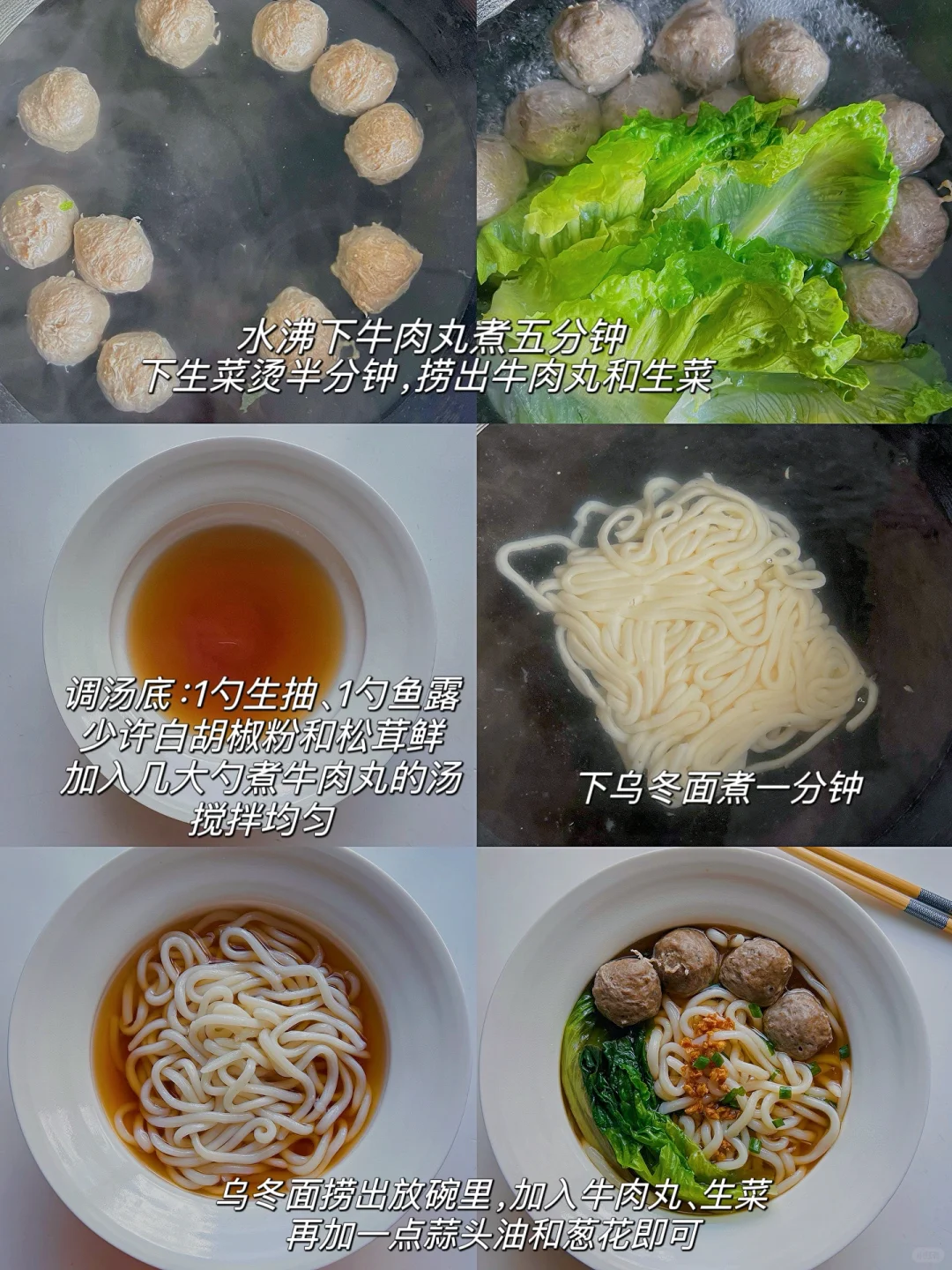 3️⃣用牛肉丸汤煮开下乌冬面煮一分钟捞入面碗,放上牛肉丸、生菜、少许蒜头油,葱花即可