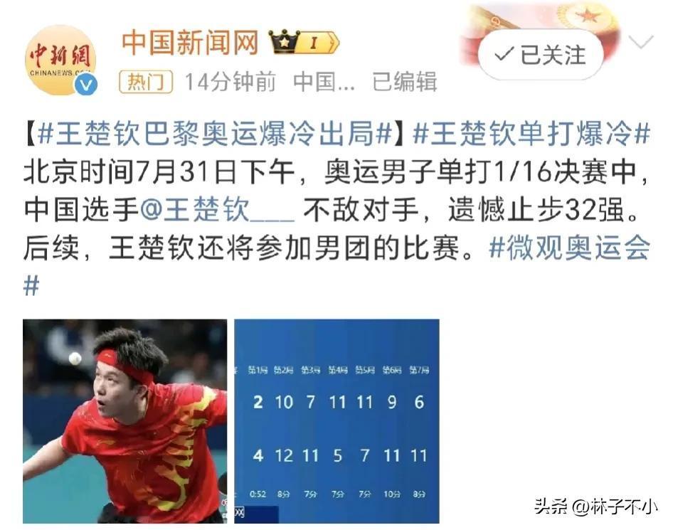 唉,王楚钦爆冷出局了。 据中国新闻刊的报道,王楚钦2:4不敌莫雷加德,那么问题来了,这场比赛跟副拍有没有直接关系呢? 毕竟之前王楚钦的球拍被摄像师踩断,引起了不小的舆论风波。 这种情况下都在猜测副球拍会影响比赛成绩,结果又发生了爆冷出局,不难让人产生联想。 换个角度考虑问题,是王楚钦水平不行,还是说王楚钦心理素质不行,还是说有别的原因? 当然胜败乃兵家常事。 #王楚钦好可惜# #王楚钦身看重任# #王楚钦失利# #王楚钦单打加油#