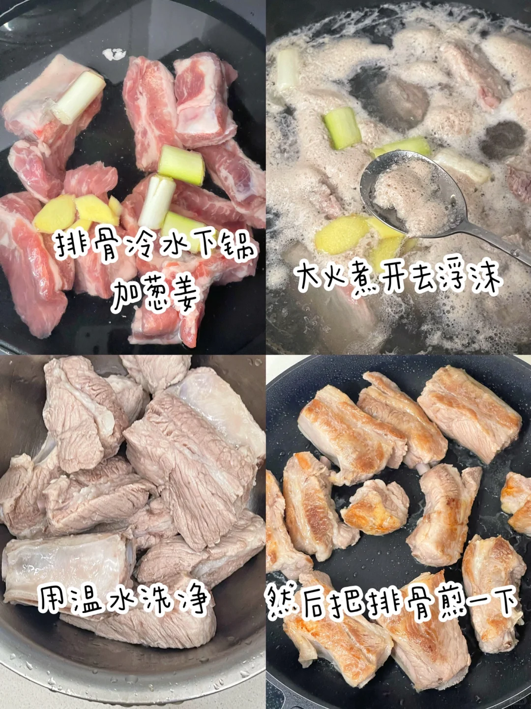 🔹排骨+葱、姜、料酒冷水下锅,大火煮开撇去浮沫。