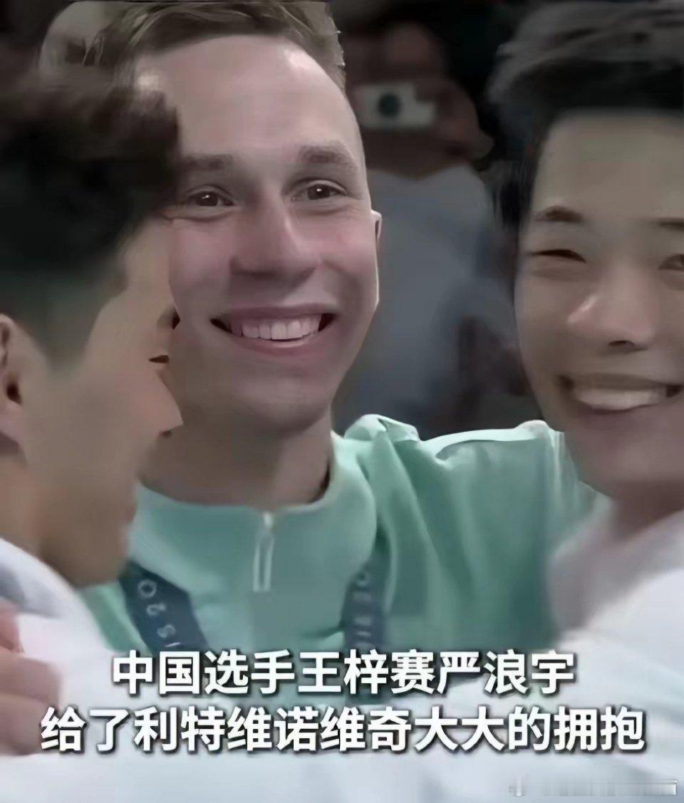白俄罗斯icon运动员利特维诺维奇icon获得男子蹦床的金牌icon,比赛结束后,他穿过层层人群找到中国队员,略显局促的站在中国队员的身后,当中国队员看到他后立即给了他一个大大的拥抱。领奖台上,没有国歌,没有国旗,但有中国的队员陪着他。颁奖仪式结束后,中国选手王梓赛icon、严浪宇icon跟他紧紧的拥抱在一起。