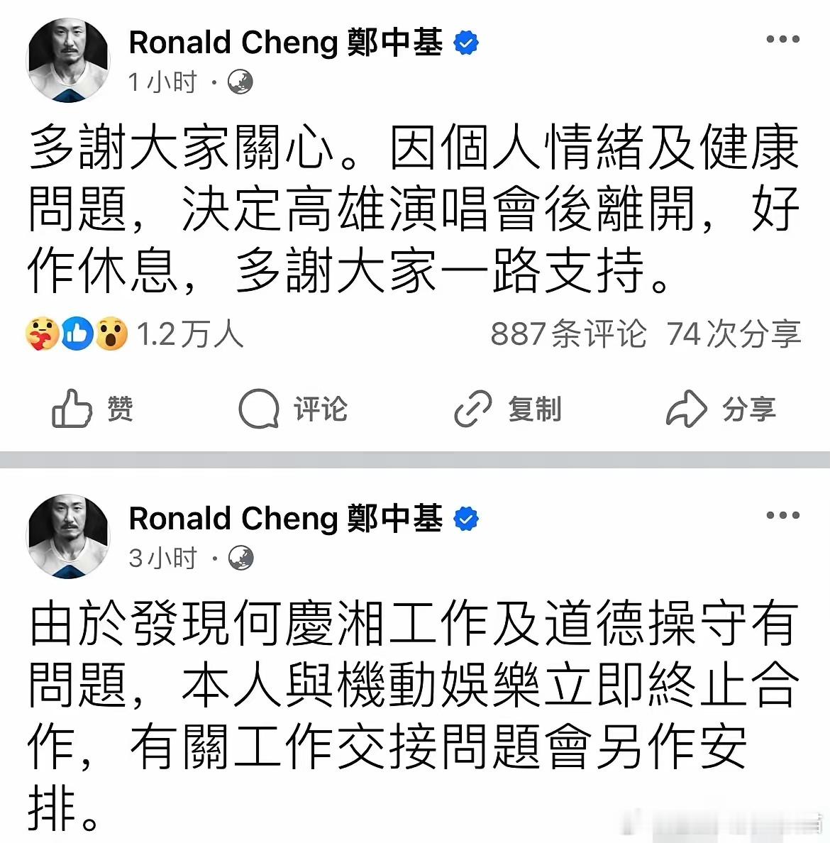原来,郑中基因为个人情绪及健康问题,将在高雄演唱会之后,开始休息,话里话外,不排除会退出娱乐圈的可能。