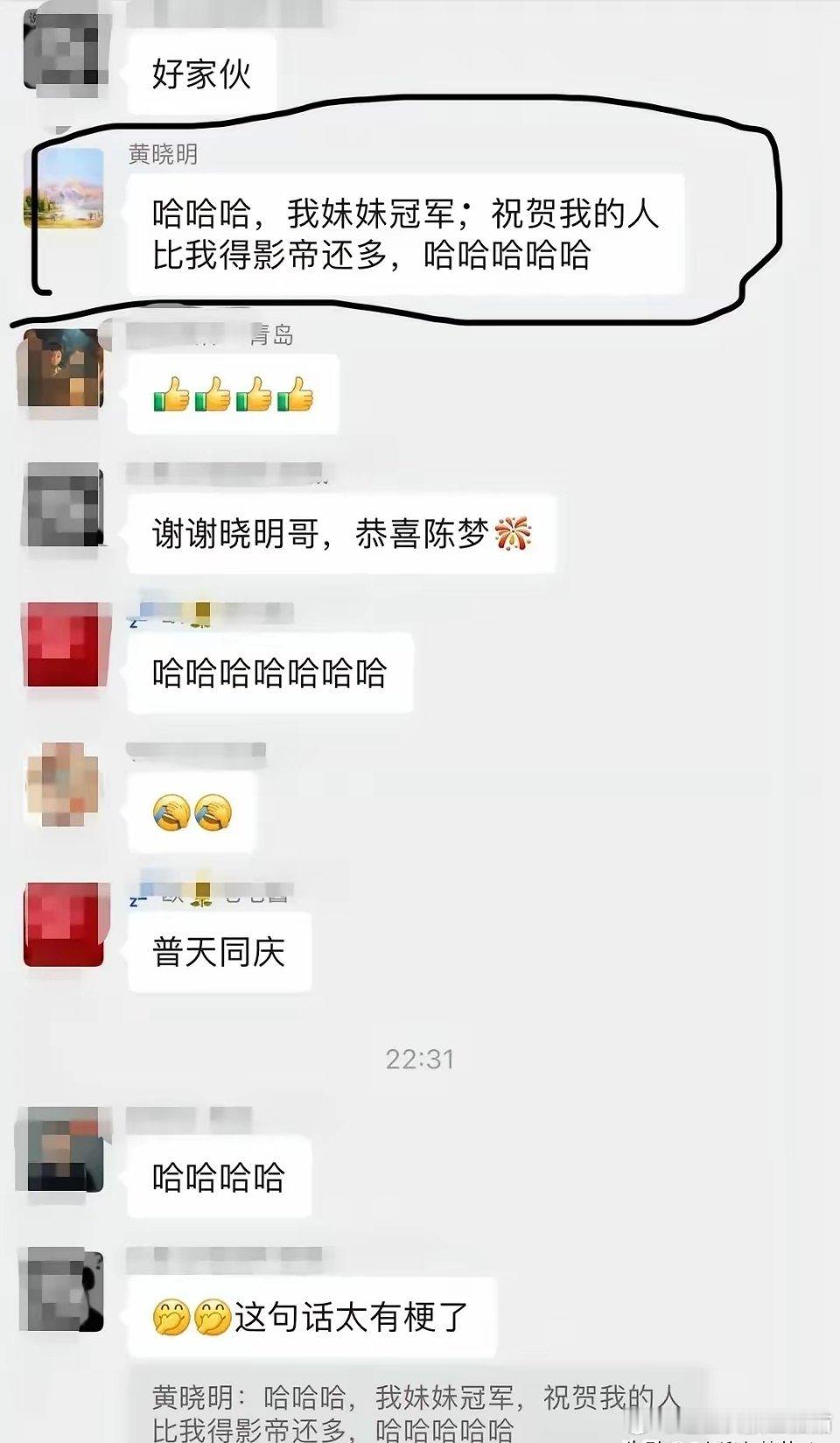 黄晓明不光发博,青岛朋友说黄晓明发了100个红包,说我妹得冠军,祝贺我的人,比我得影帝还多