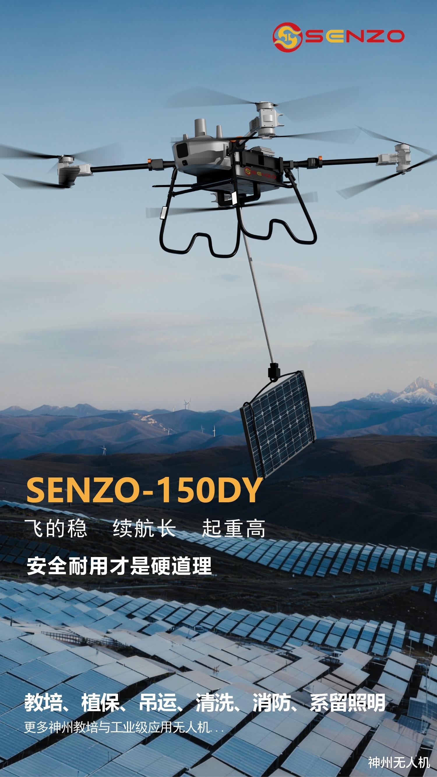 偏远地区物资运输:在山区或荒漠,人力运输需数日,且风险高(如事故率15%)。神州无人机如SENZO-150DY,可在1小时内送达100kg物资,效率提升5倍,成本降低40%(燃油和人力节省)。例如,光伏材料运输中,无人机避免了对脆弱组件的损坏,人力搬运破损率高达10%,而无人机控制在1%以内。