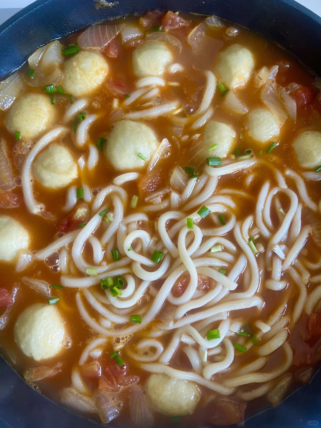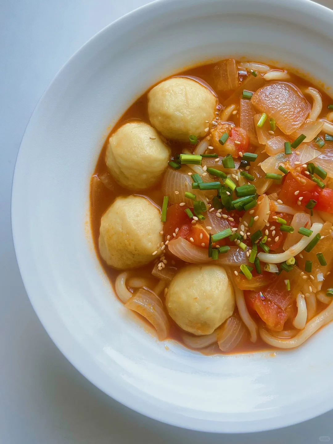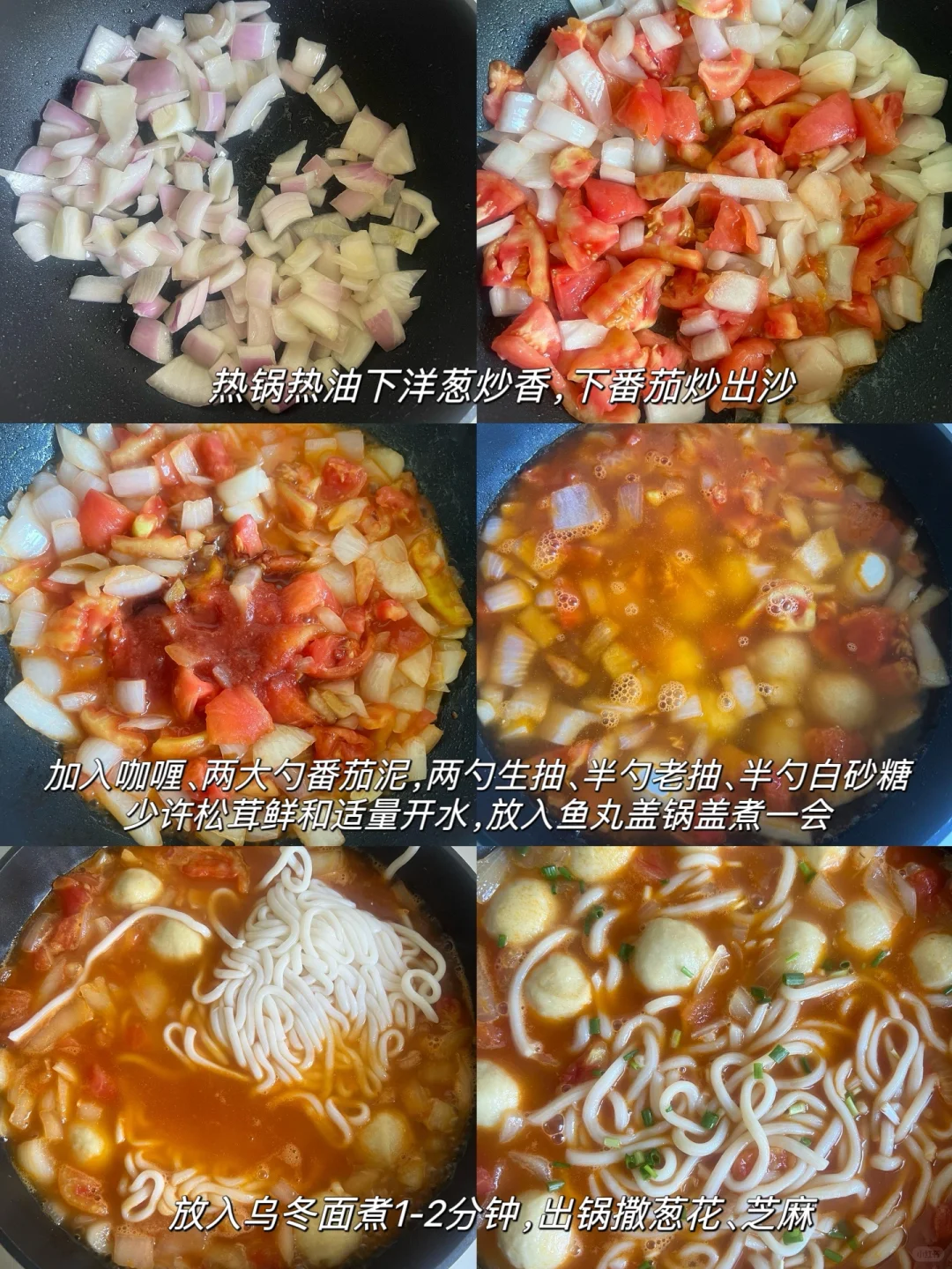 我的美食日记 今天翻冰箱才发现咖喱只剩下一块了 要烧三人份是真的不够 煮完以后番茄的味道更浓郁一点 不过真的还是很好吃呢 连面汤也可以喝光光那种!哈哈😆 👉食材: 咖喱 洋葱 番茄 鱼丸 乌冬面 番茄泥 生抽、老抽、松茸鲜美、糖、葱花、芝麻少许 方法: 1️⃣洋葱、番茄(去皮)切丁,热锅热油下洋葱炒香,下番茄炒出沙 2️⃣加入咖喱 两大勺番茄泥,两勺生抽、半勺老抽、半勺白砂糖、松茸鲜和适量开水,放入鱼丸盖锅盖煮一会 3️⃣放入乌冬面煮1-2分钟,出锅撒葱花、芝麻