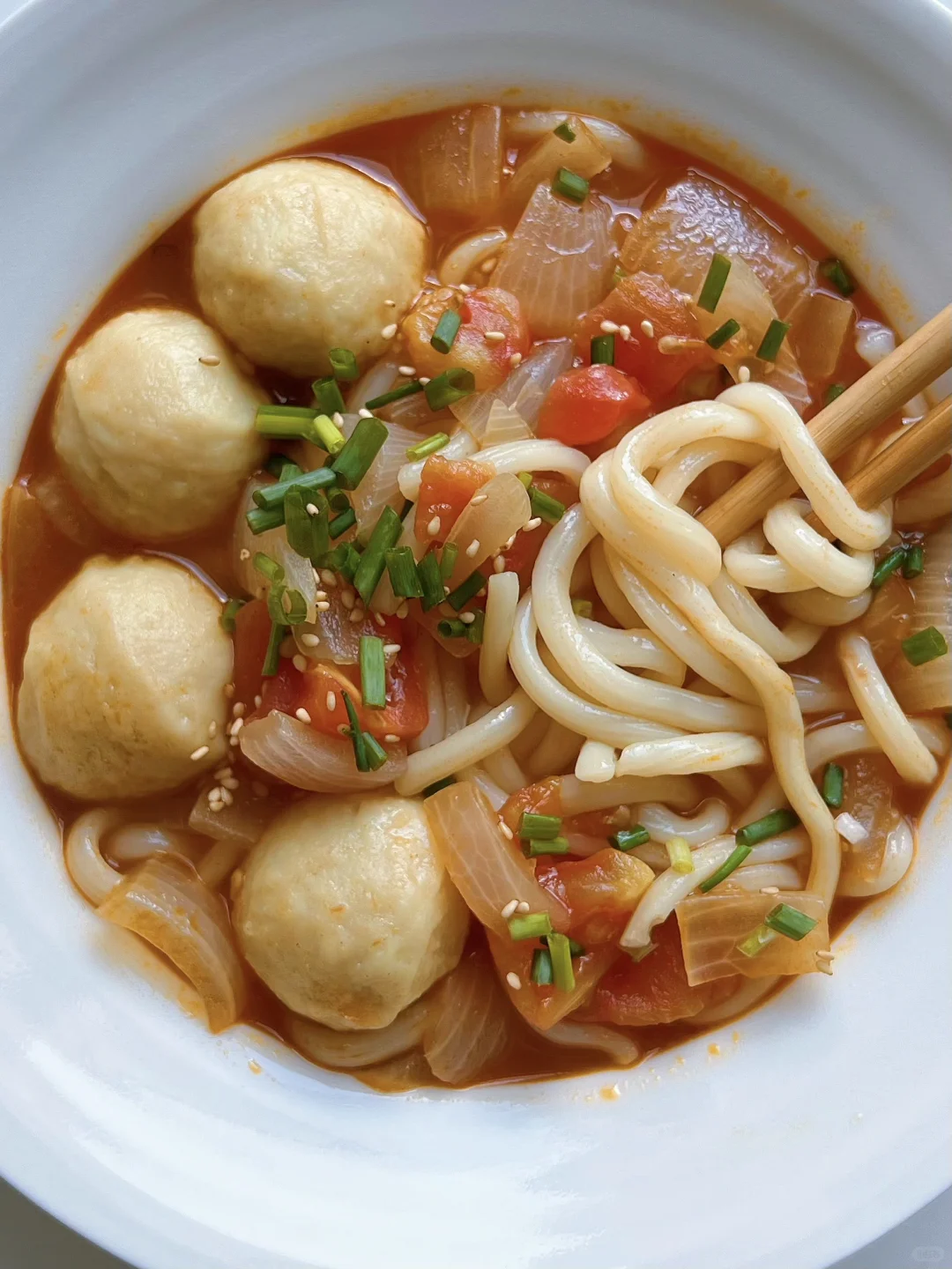哎呀呀,咖喱不够了!番茄咖喱鱼丸乌冬面🍜