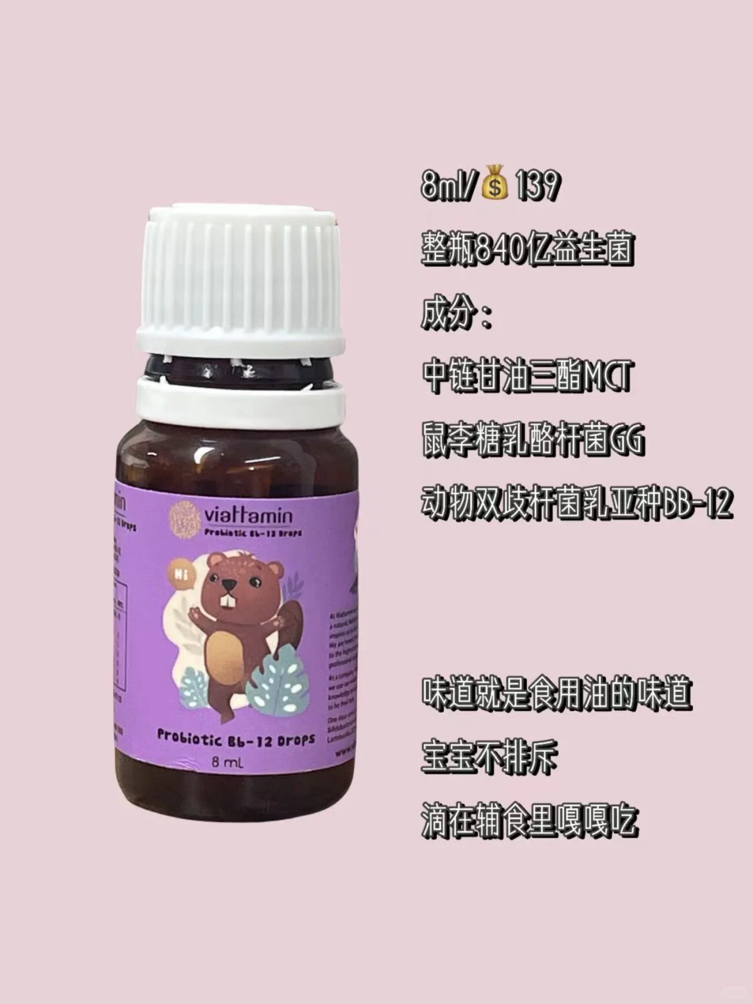 维泰美:①价格:138②规格:8ml ③每5滴21亿活菌④840亿活菌⑤成分:Bb12+GG+中链甘油三酯(MCT)微包埋技术⑥有沉淀现象⑦没什么特别的味道