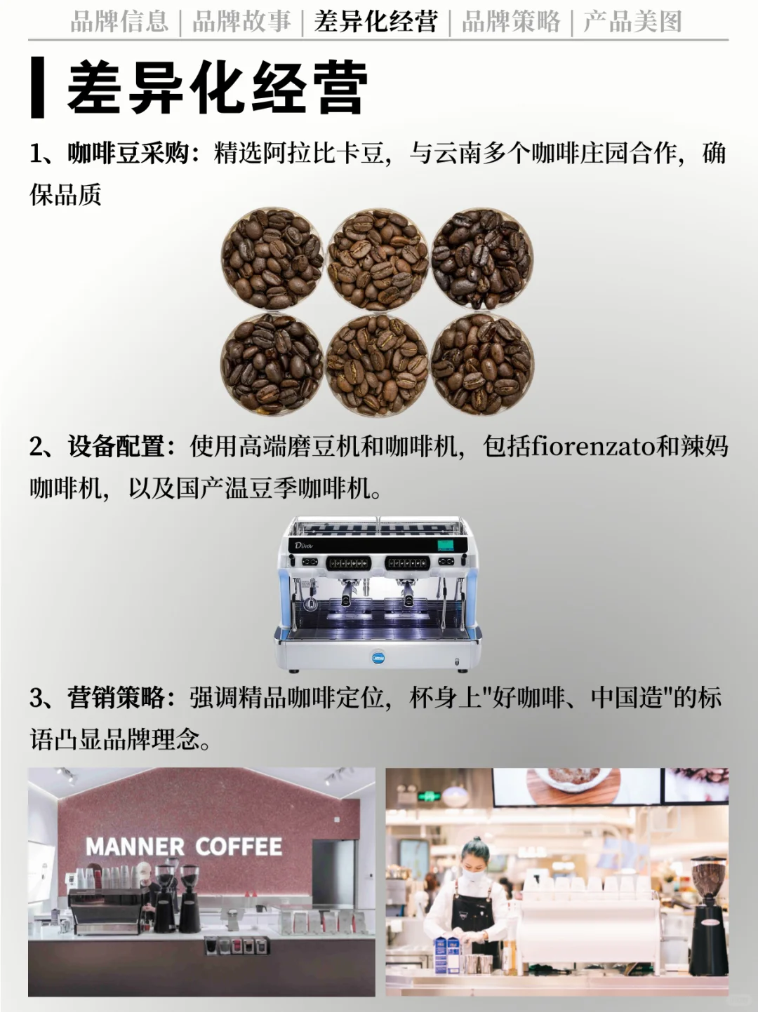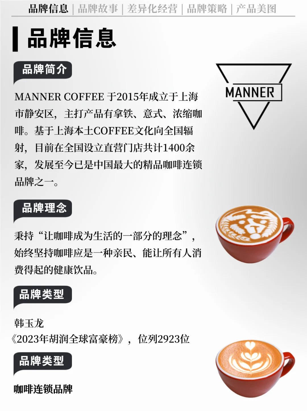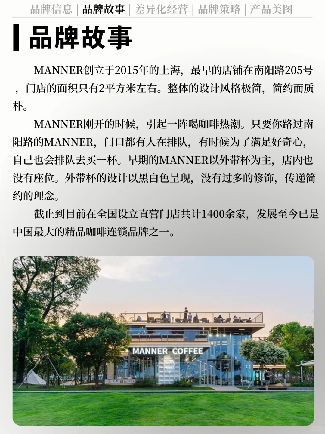 MANNER COFFEE 于2015年成立于上海市静安区,主打产品有拿铁、意式、浓缩咖啡。基于上海本土COFFEE文化向全国辐射,目前在全国设立直营门店共计1400余家,发展至今已是中国最大的精品咖啡连锁品牌之一。