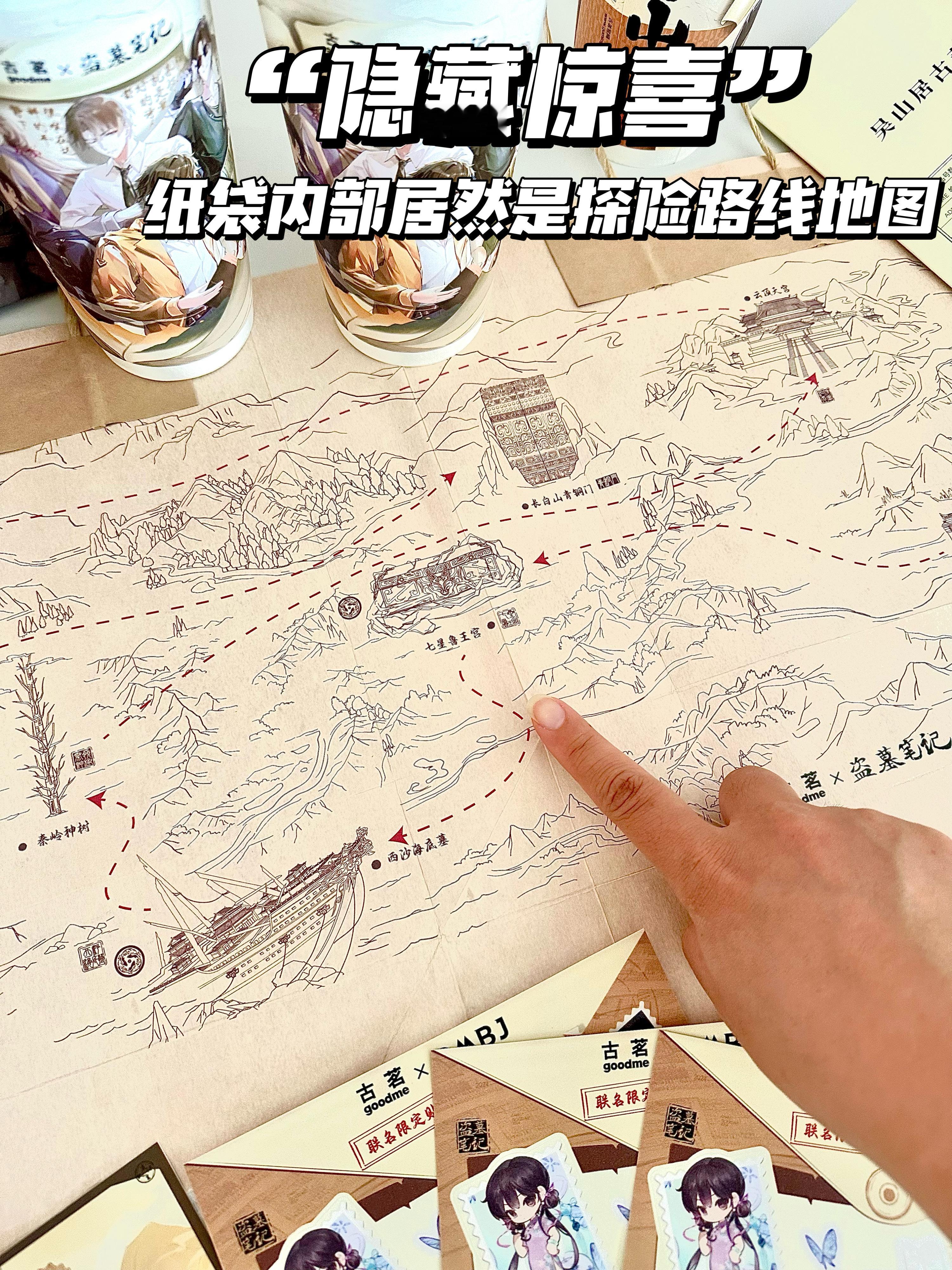 还有本次的包装:联名定制杯,联名吸管套和联名双杯纸袋也把我一整个拿捏住!联名双杯纸袋还有小惊喜,是夜光的!!并且内部有探险路线地图!#古茗#你就是联名楷模!