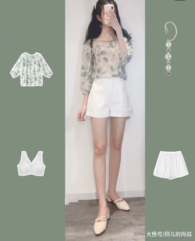 第一眼看上去就觉得很清新的一套穿搭,水墨绿叶图案设计的雪纺上衣,雪纺面料是半透的,上面的印花颜色却能给人一种清新淡雅的既视感,搭配白色西装短裤,那么日常休闲的装扮,夏季这样穿着出行度假都ok。