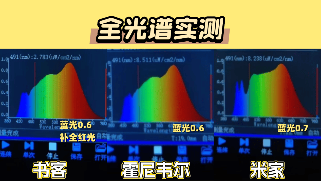 实测原因:全光谱是判断护眼灯是否护眼的关键步骤,尤其是蓝光峰值、红绿光补全、光谱连续性等核心指标,高蓝光是影响视网膜损伤、儿童视力发育的重要因素之一,而红光缺失以及连续性低都会对还原自然光以及护眼效果造成一定的影响。