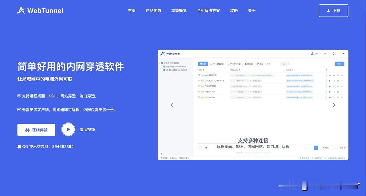 WebTunnel 内网穿透软件有分组功能啦! 大家可以通过分组功能,更方便的对连接进行逻辑分组,例如按地理位置分组、按组织机构分组等... 还有一个好消息,如果大家手头有闲置的公网服务器,可以联系我们部署您的专属通道,此通道仅供您个人使用,可以有效提升连接速度和安全性。[得意] 以上功能包含在了 WebTunnel vj.240817 版本中,此版本其他更新如下,欢迎大家下载体验哈! PS:此版本不涉及外壳更新,因此无需下载最新的应用程序,重新打开或点击刷新按钮即可升级为最新版本。 ================ 1、新增了分组功能,可以对连接进行逻辑分组,例如按地理位置分类、按组织机构分类等,提高管理效率 2、支持按主机名添加,之前仅支持 IP 3、修复了偶现的并发查询报错的问题 4、优化了表格布局,支持了表格列内容的自动隐藏和列宽调整 5、优化了 docker 部署,可以在 20 分钟内完成整套平台的私有化部署 6、添加了共享通道激励计划,大家的闲置公网服务器可以加入共享通道中 7、支持私有化通道,可以在自己的服务器上部署通道组件,仅供个人使用 ================