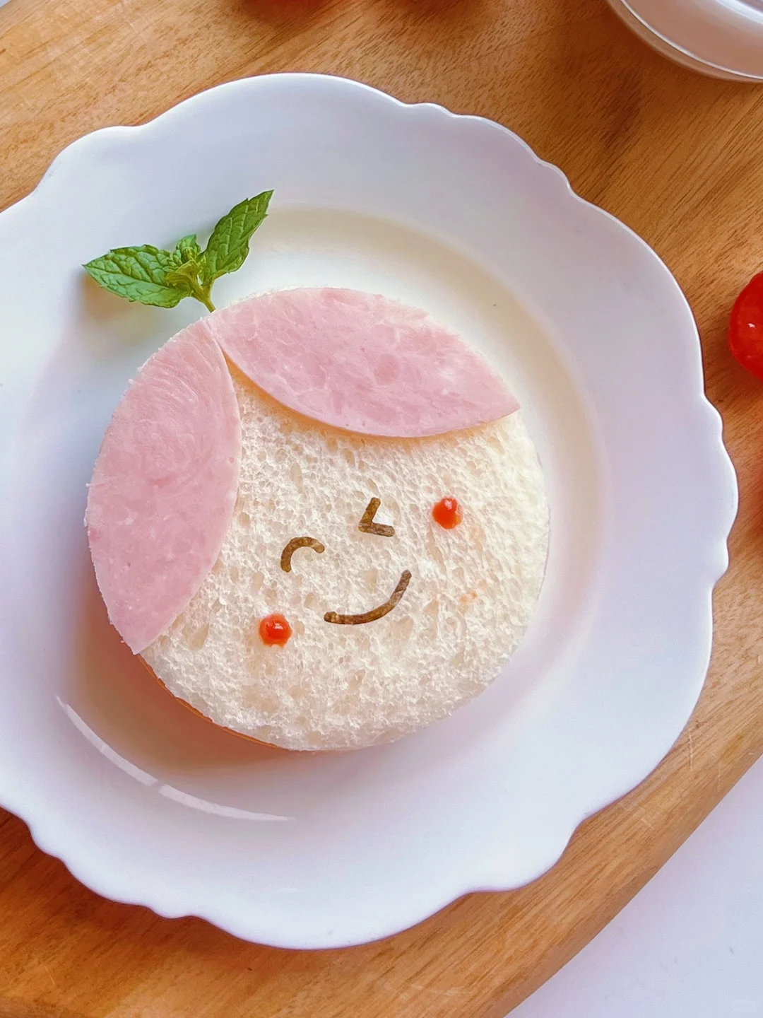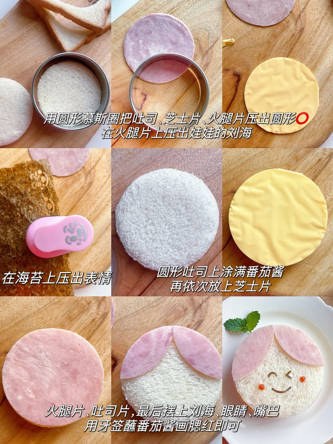 平替美食大赏 今天是可可爱的小天使娃娃 食材简单,操作快捷方便 没有慕斯圈用圆形的玻璃杯、瓶盖都可以的呢 【食材】 吐司两片 圆形火腿两片 芝士片一片 番茄酱 海苔 【使用工具】 圆形慕斯圈和表情压花器 【步骤】 1️⃣用圆形慕斯圈把吐司、芝士片、火腿片压出圆形⭕️,在火腿片上压出娃娃的刘海 2️⃣组装:圆形吐司上涂满番茄酱(忘记拍),再依次放上芝士片、火腿片、吐司片,最后摆上刘海、眼睛、嘴巴,用牙签蘸番茄酱画腮红即可
