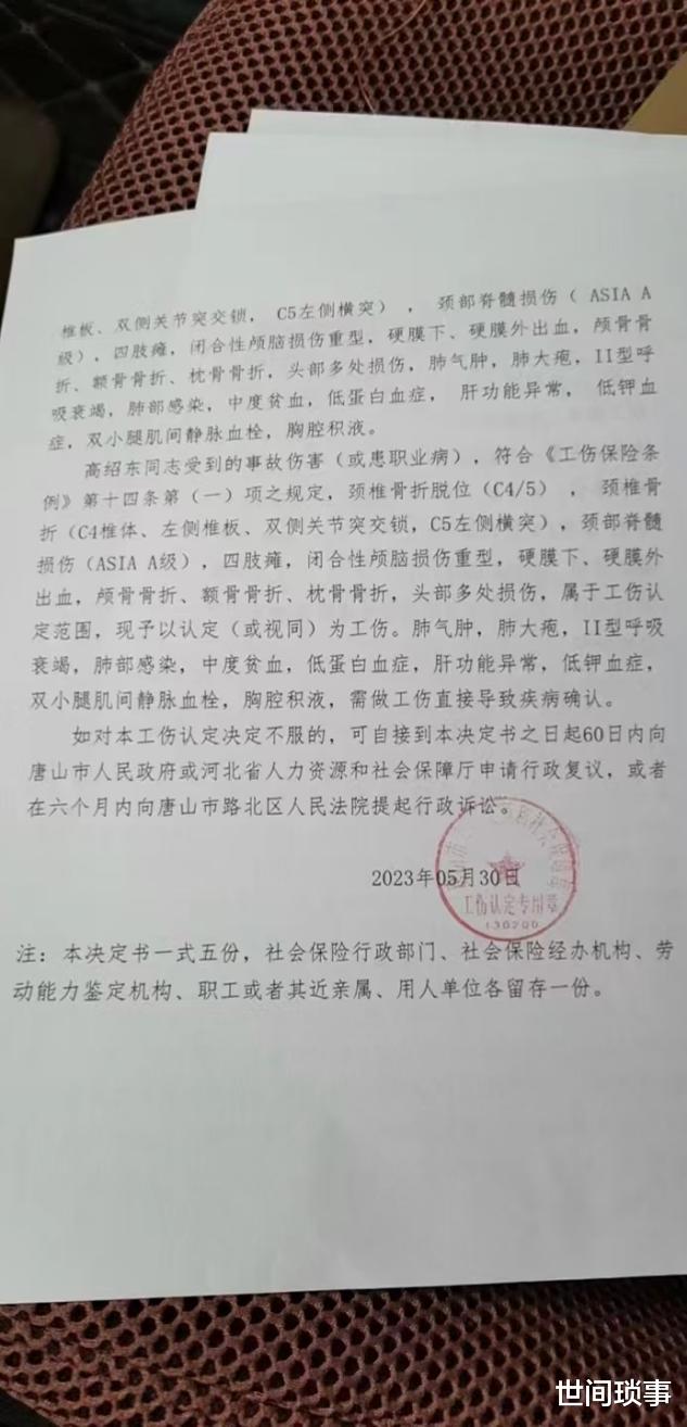 2023年5月30日,唐山市人力资源和社会保障局作出《认定工伤决定书》,明确高绍东所受伤害属于工伤。2024年10月17日,唐山市劳动能力鉴定委员会出具《初次鉴定结论书》,鉴定其为一级伤残、完全护理依赖,需配置防褥疮床垫等辅助器具。然而,工伤认定后的赔偿环节,却出现了巨大分歧,更让高绍东一家雪上加霜的是,治疗过程中屡屡因单位拖欠住院费陷入困境。