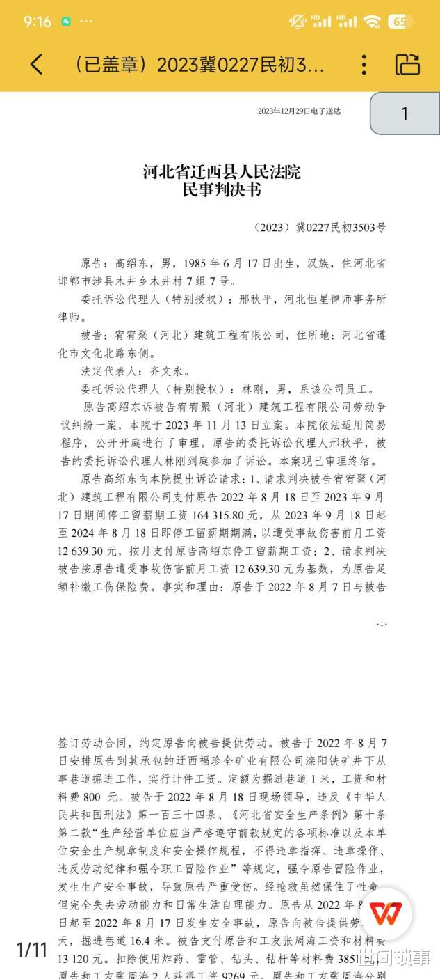 2023年11月,迁西县劳动人事争议调解仲裁委员会作出仲裁裁决,以3475元/月的社保缴费基数为标准,支持了部分停工留薪期工资,但驳回了补缴工伤保险费、按实际工资计算待遇等请求。而截至目前,宥宥聚公司连仲裁支持的停工留薪期工资都未给清,一次性伤残补助金及差额更是分文未付,面对追问,单位反而以“双方一直在上诉”为由推诿,称无法履行相关支付义务。高绍东不服仲裁结果,向迁西县人民法院提起诉讼。