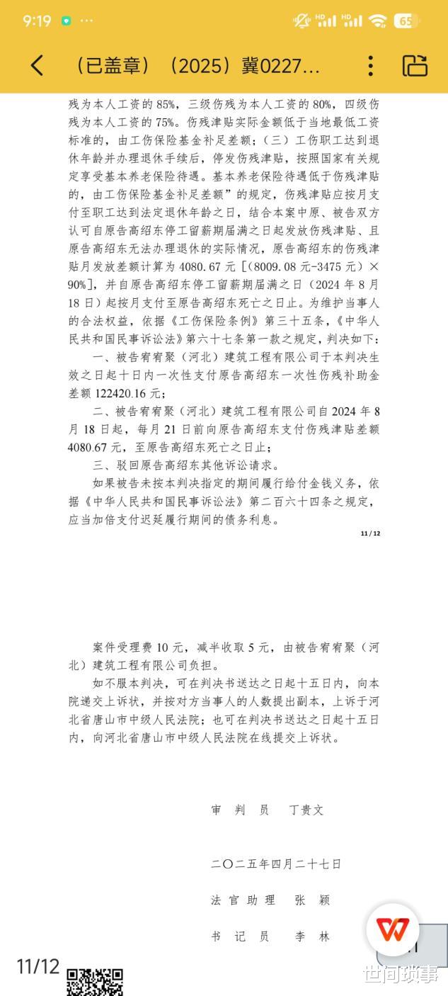 2025年4月27日,迁西县人民法院作出一审判决,支持了一次性伤残补助金差额122420.16元(按8009.08元/月与3475元/月的差额计算),并判决公司自2024年8月18日起,每月支付伤残津贴差额4080.67元至高绍东死亡之日止,驳回了其按12639.3元/月计算赔偿及一次性支付伤残津贴的诉求。