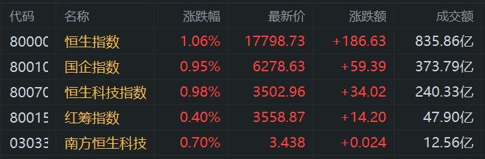 格隆汇8月26日|港股三大指数集体收涨,截止收盘,恒指涨1.06%,盘中重回17800点并且创下反弹新高,国指、恒生科技指数分别上涨0.95%及0.98%,市场回稳上升明显。