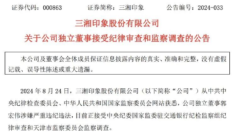 三湘印象(000863)8月26日晚间公告表示,公司独立董事郭宏伟涉嫌严重违纪违法,目前正接受中央纪委国家监委驻交通银行纪检监察组纪律审查和天津市监察委员会监察调查。