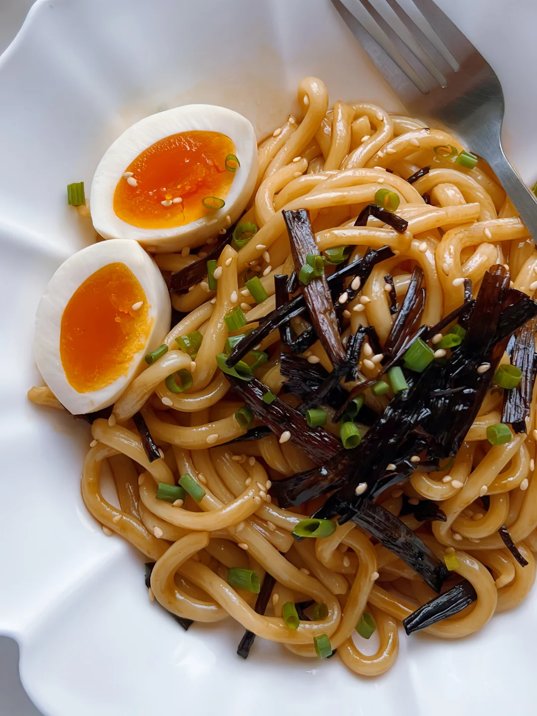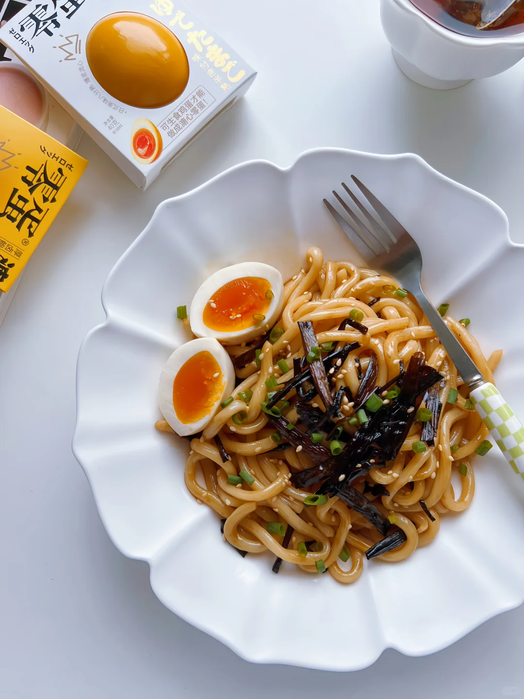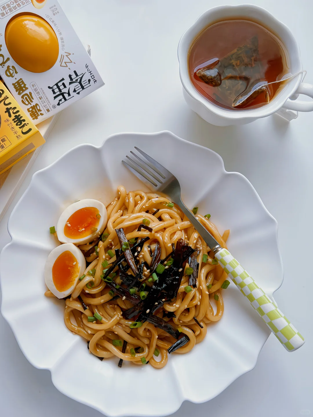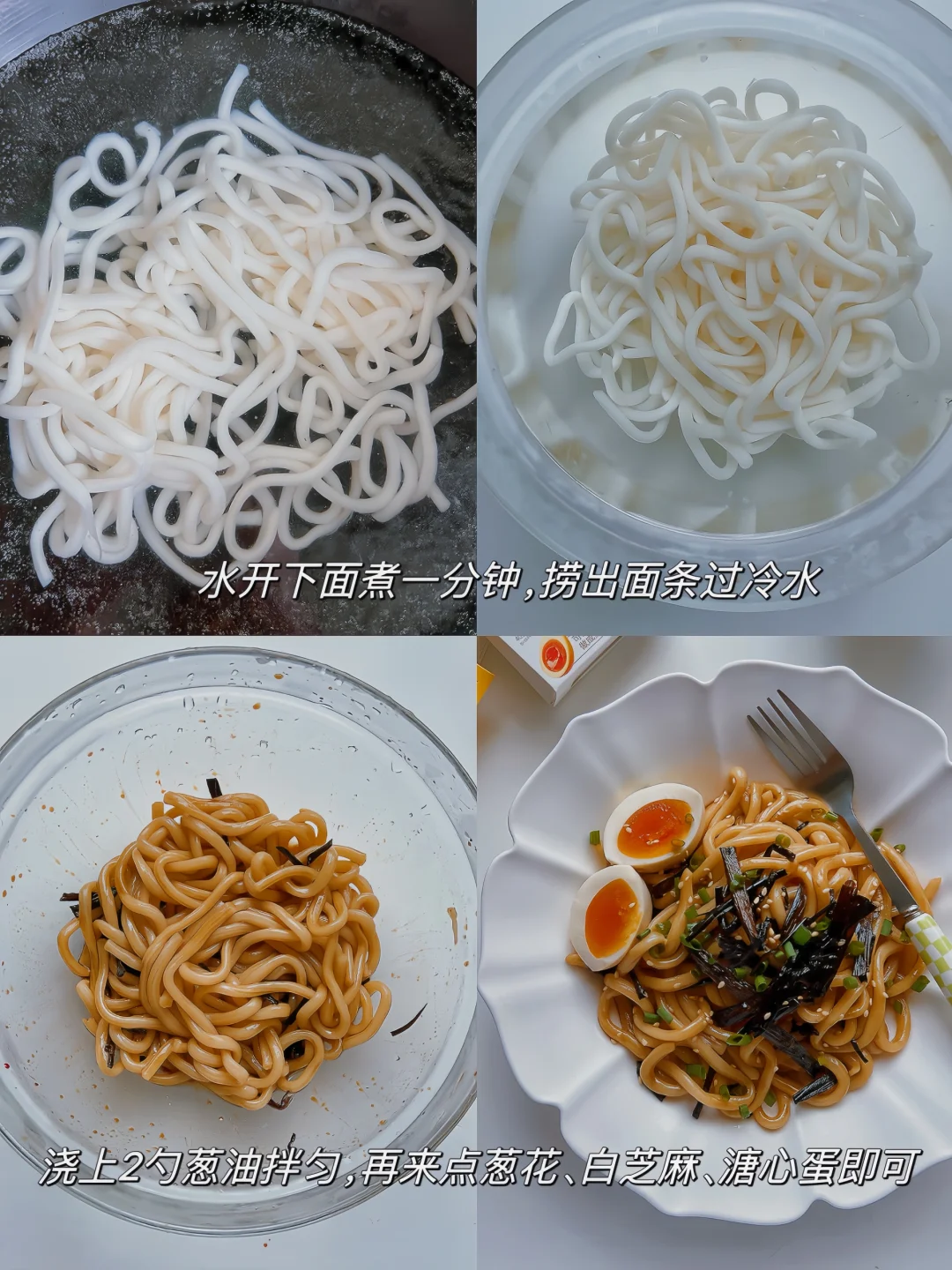 4️⃣煮乌冬面:水开下面煮一分钟(看说明书要求),捞出面条过冷水(也可不过),浇上2勺葱油,拌匀,再撒点新鲜的小葱、白芝麻、溏心蛋,完美!