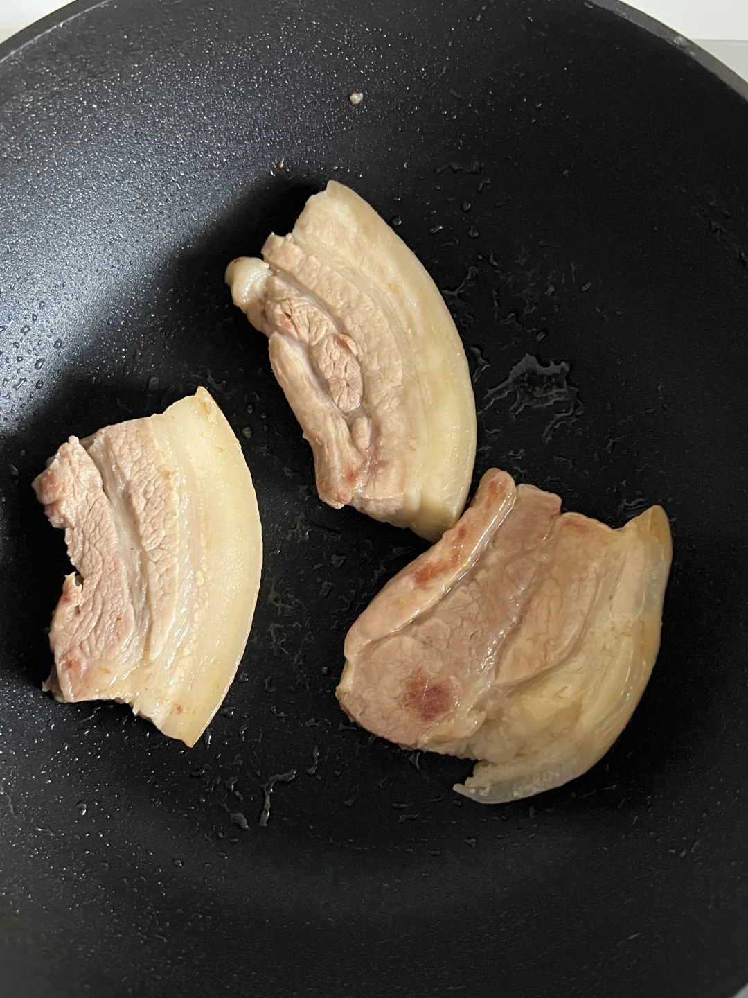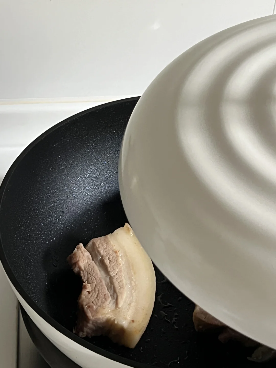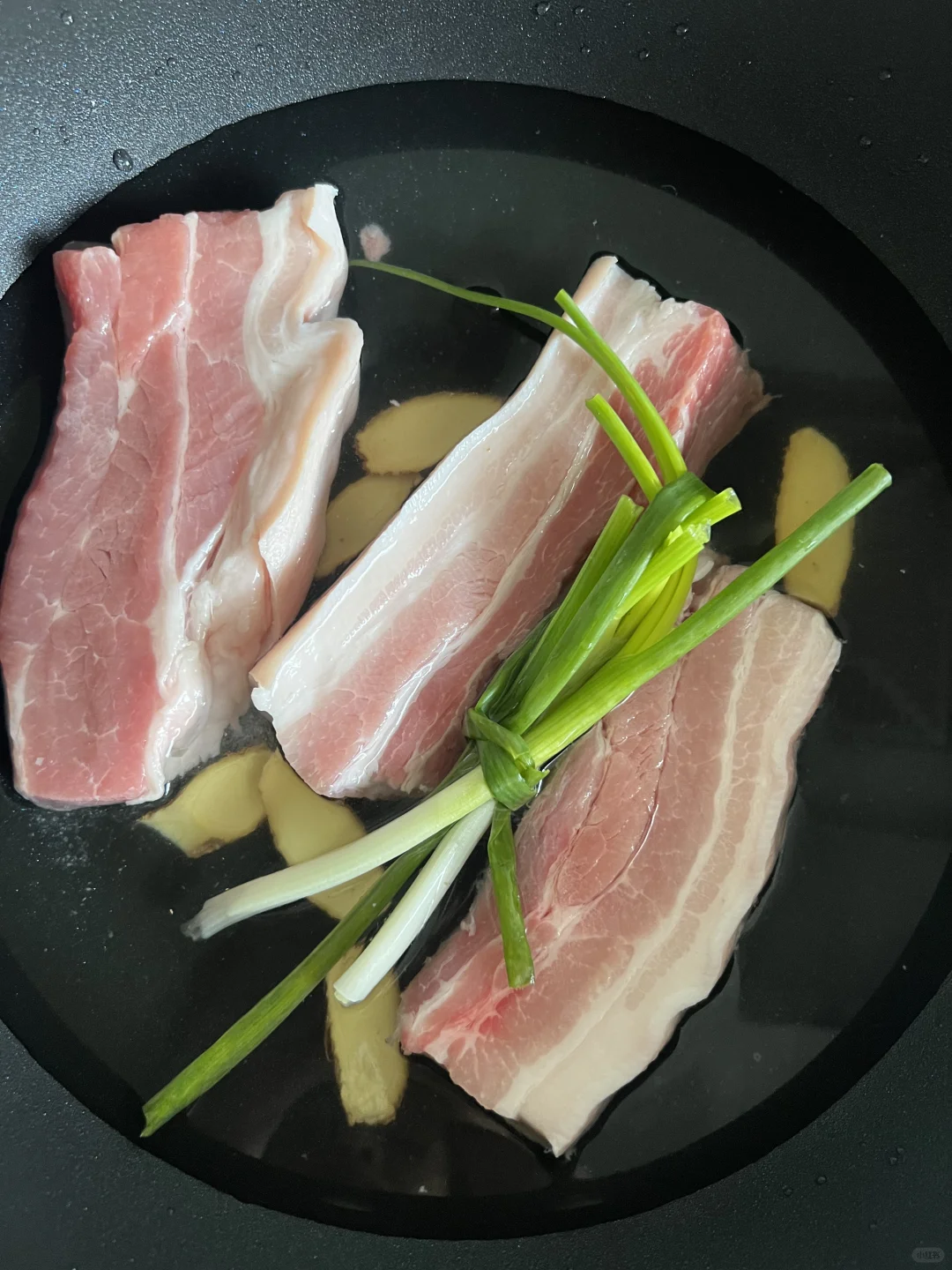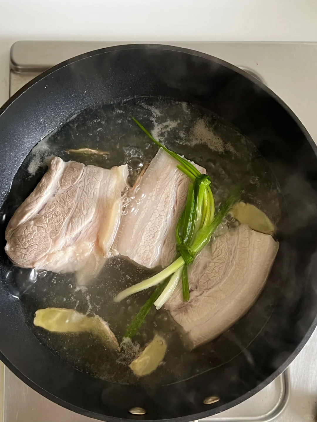 1️⃣五花肉洗净放入锅内,加入一小勺盐、生姜片、一个葱结、少许料酒,加入清水没过五花肉,大火煮开,撇去浮沫,转中小火