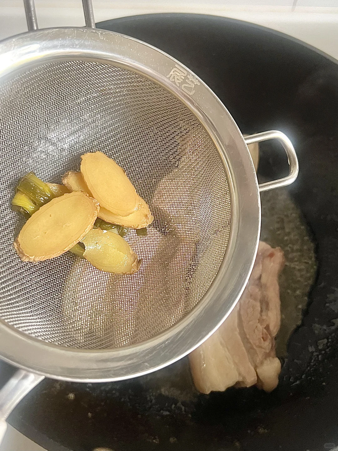 2️⃣煮干水分,捞出生姜、葱结,用厨房纸巾擦干净锅
