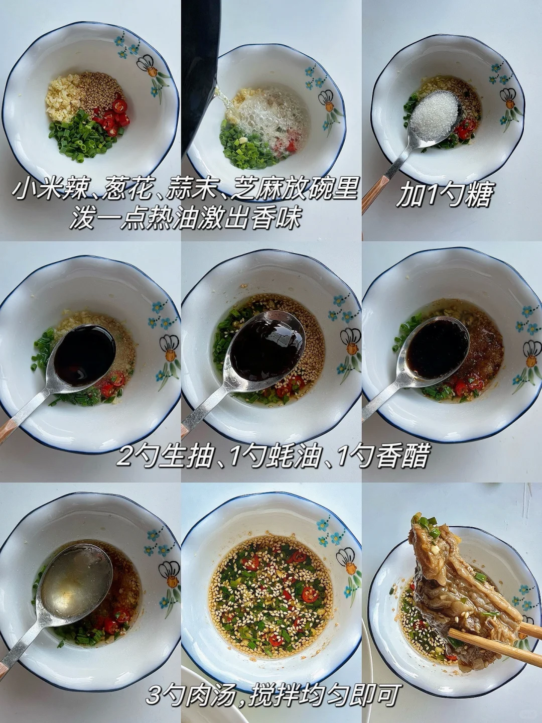 小米辣、葱花、蒜末、芝麻放碗里,烧一点热油激出香味,加入两勺生抽酱油、1勺蚝油、1勺香醋、3勺肉汤搅拌均匀即可