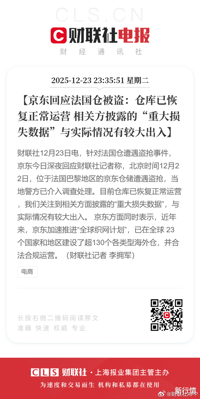 如今,2025行至岁末,结合本次法国巴黎仓库被盗事件后的官方回应中,京东所透露的:截至2025年12月,京东物流已在全球23个国家和地区建设了超过130个各类型海外仓。