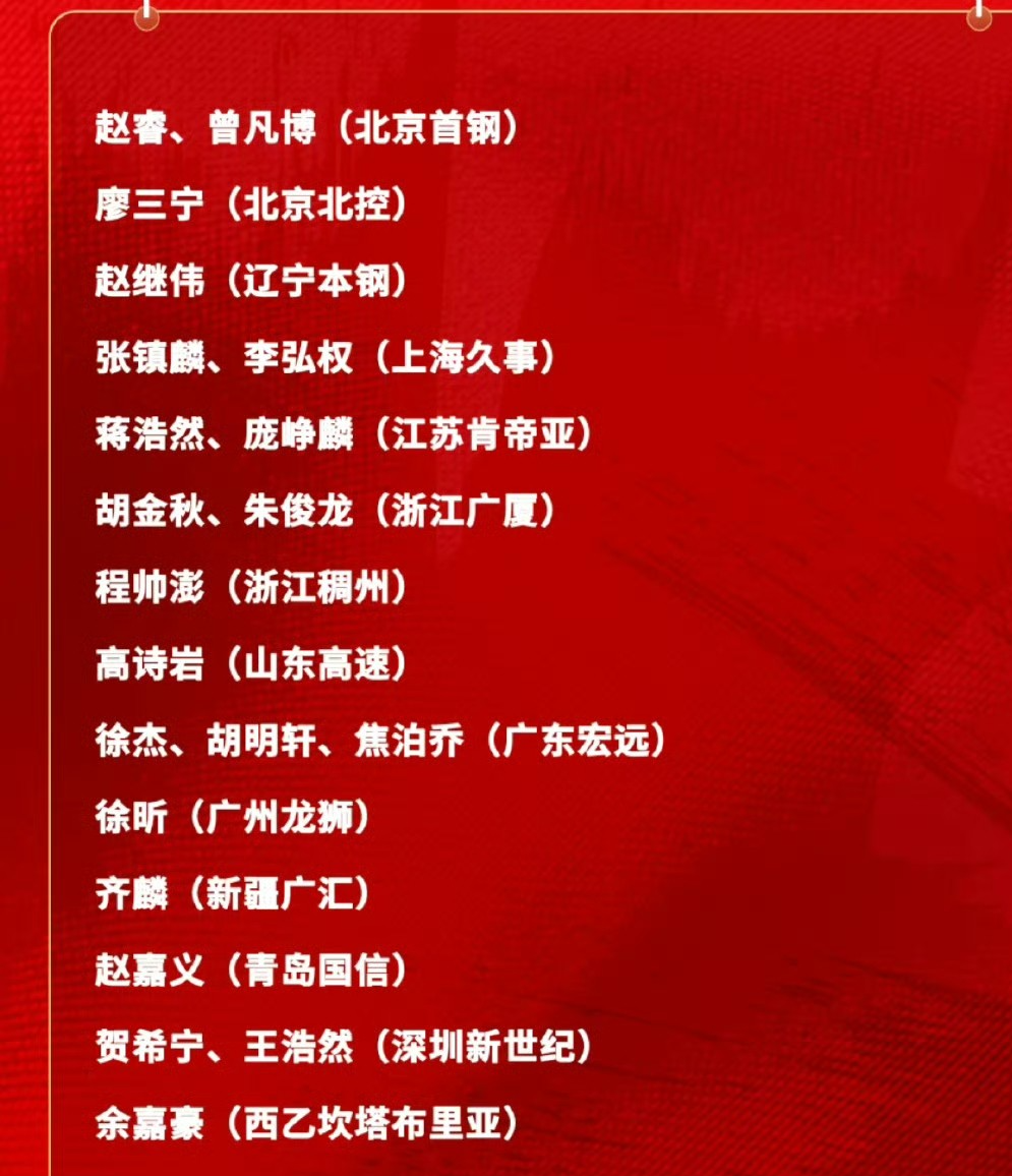 先来看集体名单,北京首钢男篮赵睿、曾凡博,北控男篮廖三宁,辽宁男篮赵继伟,上海男篮张镇麟、李弘权,江苏肯帝亚男篮蒋浩然、庞峥麟。