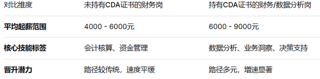 数据印证价值:根据业内薪酬调研数据显示,在同等学历和工作经验背景下,持有CDA证书的财务相关岗位求职者,其起薪与薪资涨幅显著高于无证者。以下是一个简明的对比示意: