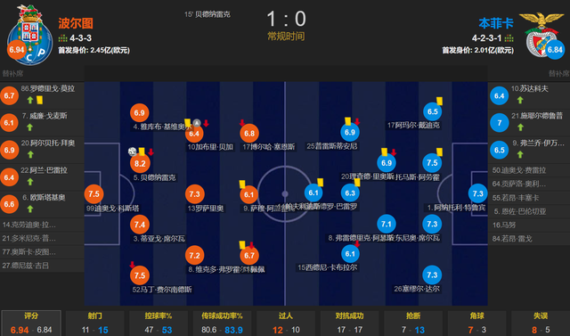 全场比赛,波尔图的控球率为47%,一共有11次射门,其中5次射正;本菲卡一共有15次射门,其中3次射正。